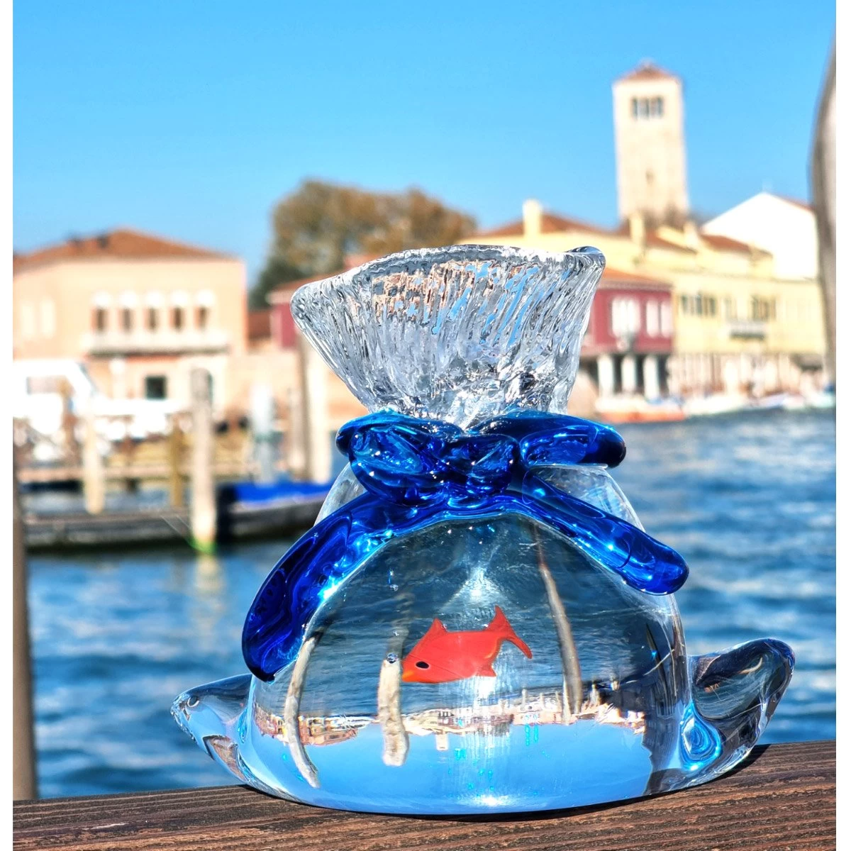 Beautiful aquarium glass sculpture, made with “sommerso” technique. This art work is handmade with a very difficult technique: first the glass master makes the little fishes and after he melts them into a glass stone at high temperature.