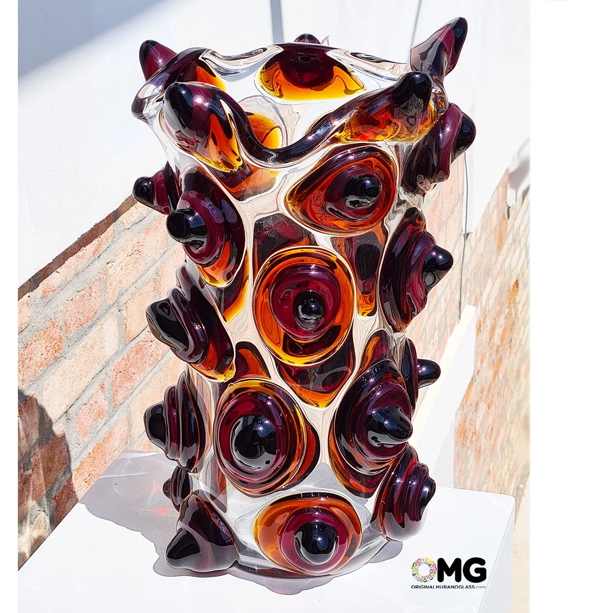 The transparent colors and the spots of this original Murano glass vase are the main elements that give it its particular aura. In this way, an object of common use becomes an object of value useful for furnishing an imperial style table or wooden furniture.