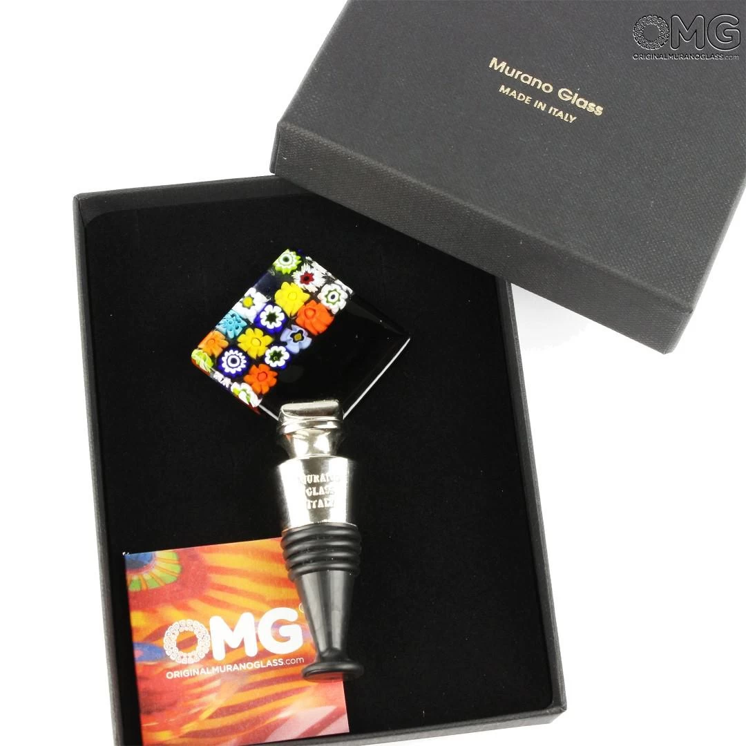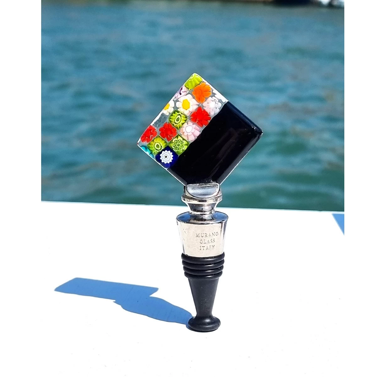 Bottle stopper handmade with the technique of fusing glass in Original Murano Glass, black glass and with addition of mix millefiori colors.