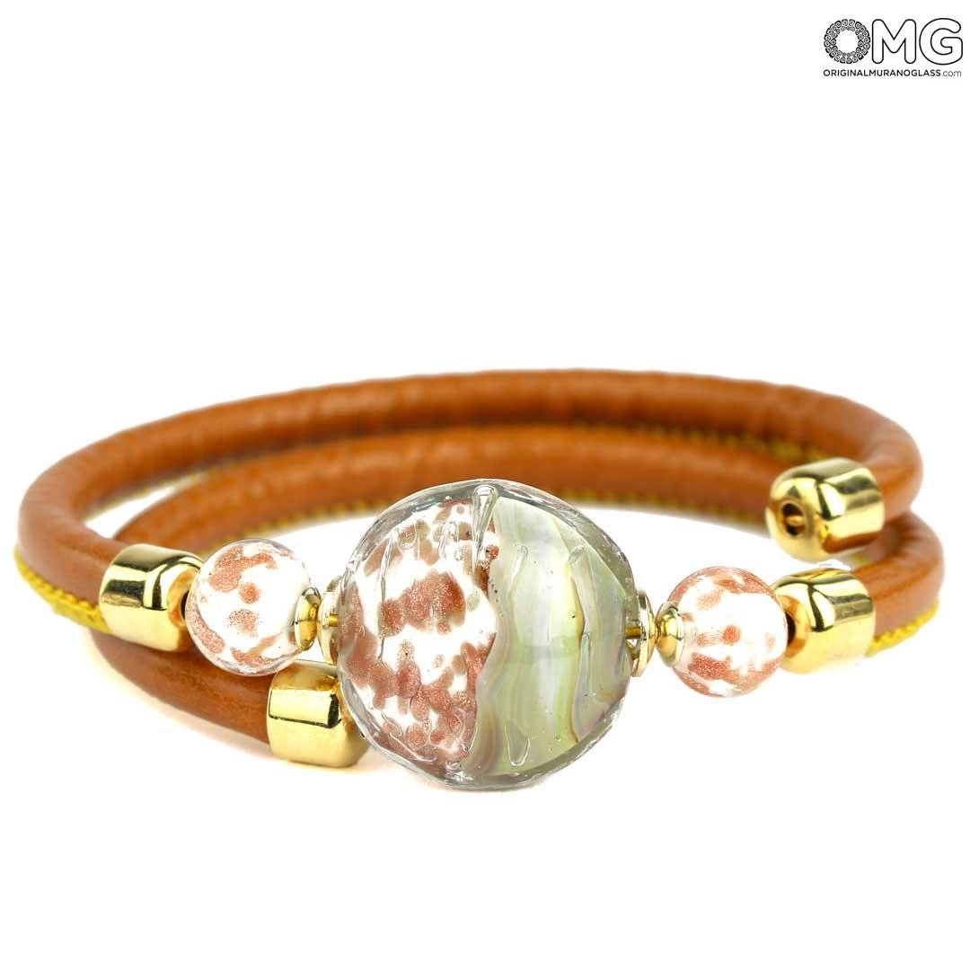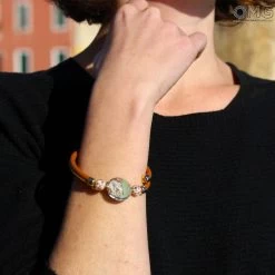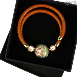 Beads are made in glass molten and embellished with different colors and submerged avventurina, while the strap is in leather, so this bracelet is a perfect jewels for the woman who need something for a special events or is looking for something to dress in every moment of the day.