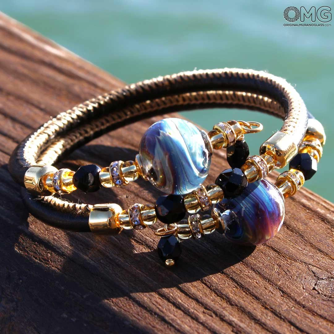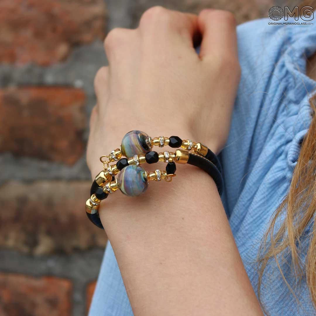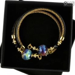 Beads are made in glass molten and embellished with different colors and chalcedony glass, while the strap is in leather, so this bracelet is a perfect jewels for the woman who need something for a special events or is looking for something to dress in every moment of the day.