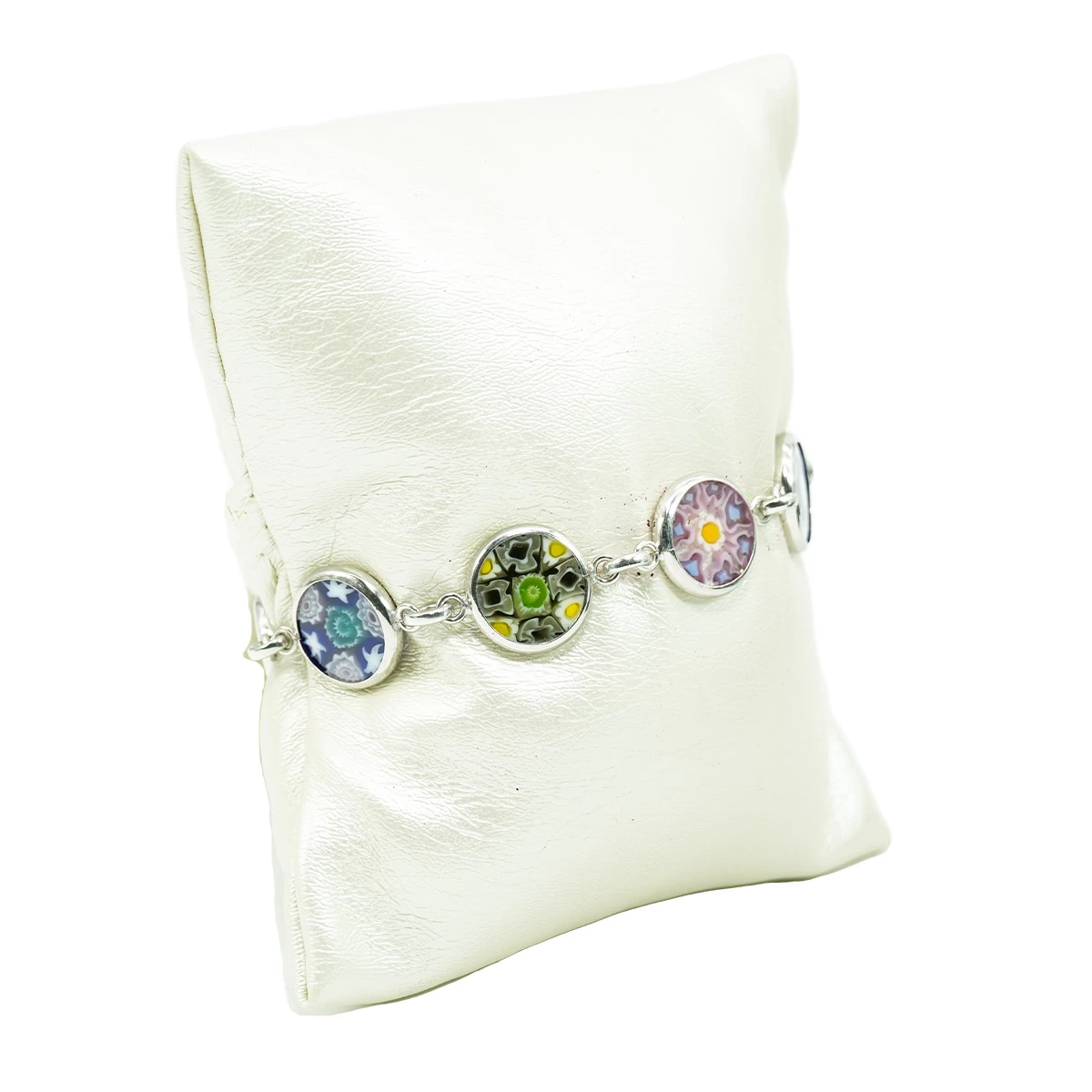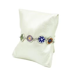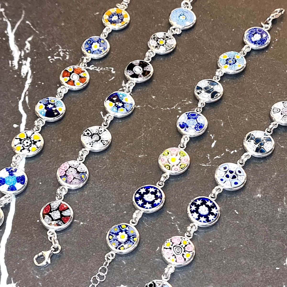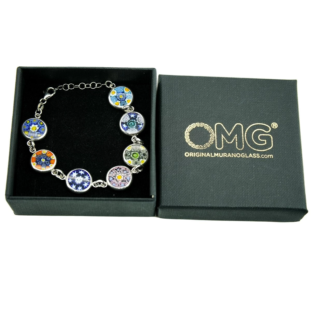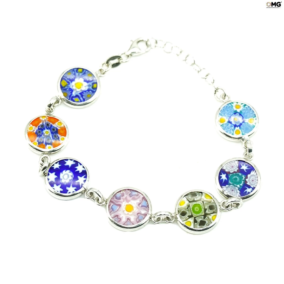 Unique and elegant, this Venetian bracelet is hand-made using the most famous Murano glass technique, Millefiori Murrina (a thousand flowers) – which has become a trademark of Murano glass making. This easily-recognizable Murano glass accessory features a symmetric eye-catching pattern of colorful stylized flowers in rich hues, which will add a touch of authentic Venetian style to any outfit. This bracelet is made in lamp working technique, and each piece is worked as single .