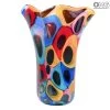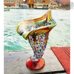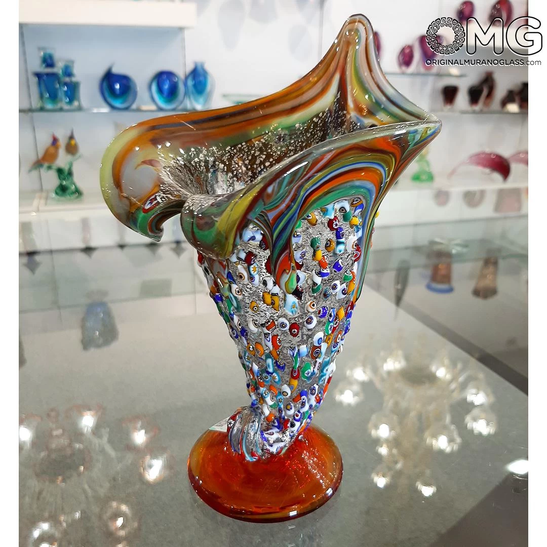 Vase handmade with the technique of glass blowing with silver and murrina milelfiori decoration. The artwork is signed by the glass master and with Vetro Artistico® Murano trademark applied.