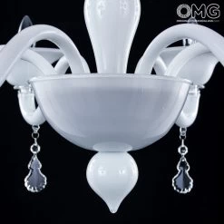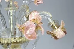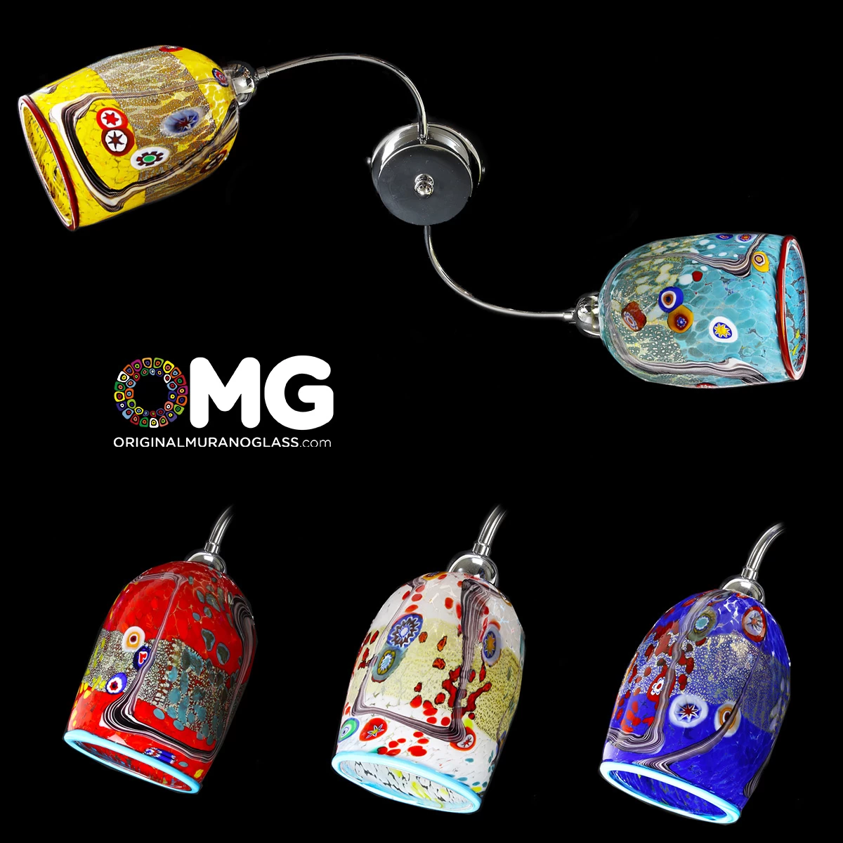 Murano glass ceiling lamp handmade in blowed glass, 2 lights, with cups in artistic glass with colored stripes, murrine and pure silver.