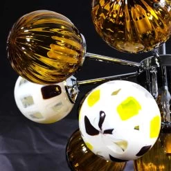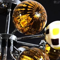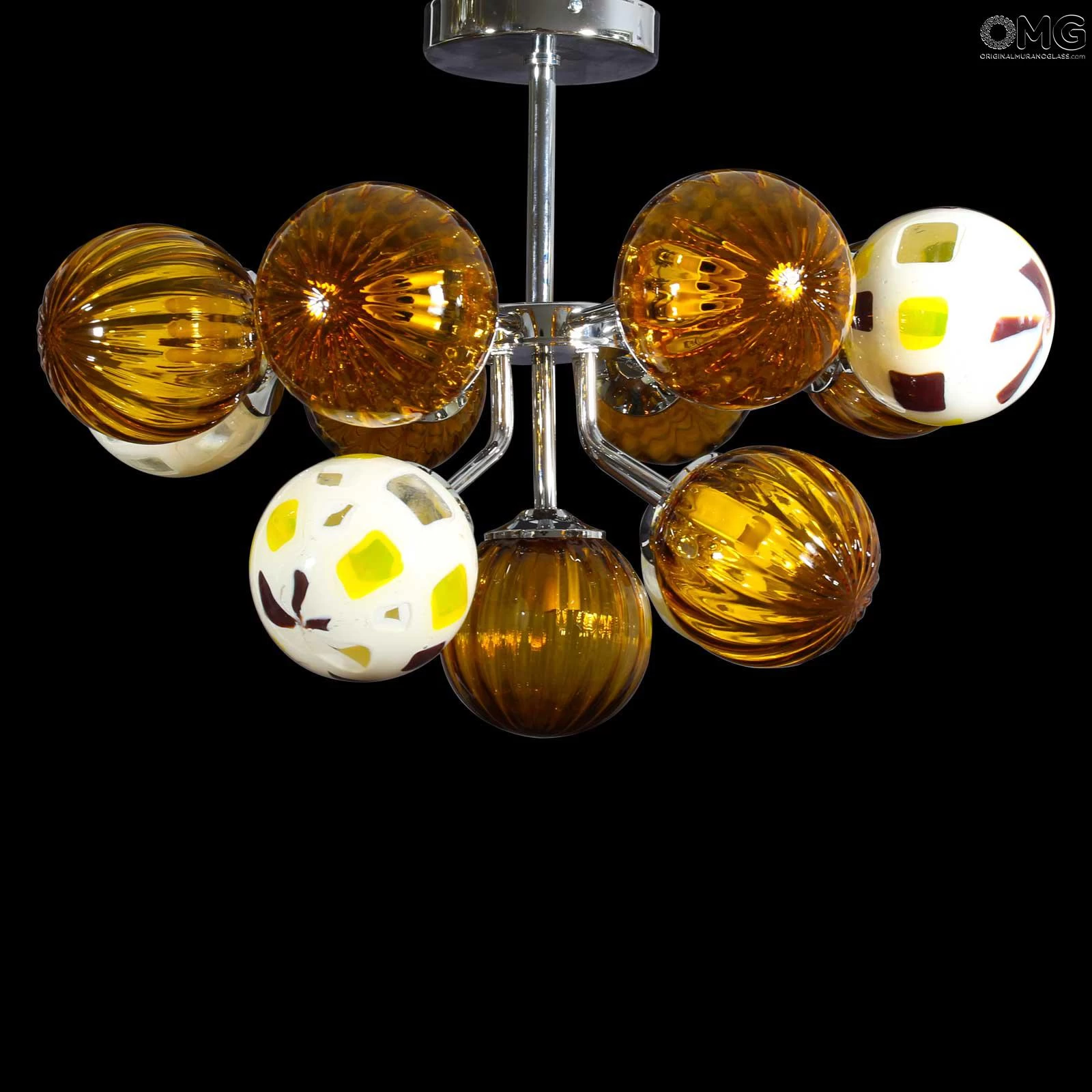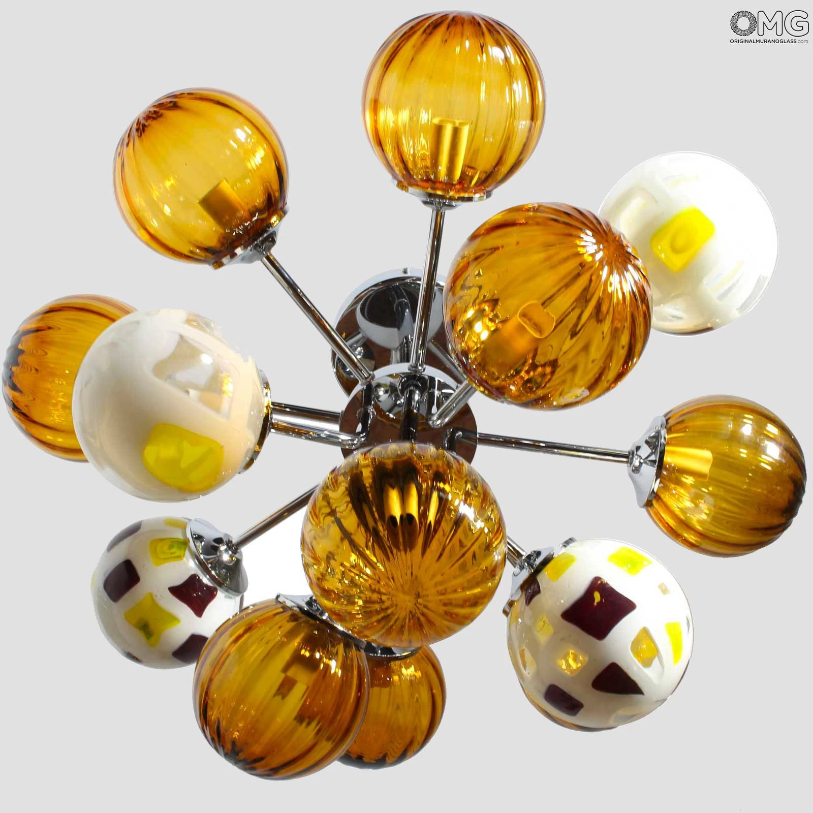 This exclusive ceiling lamp is made with 13 lights in amber color tonality with polychrome details colors.