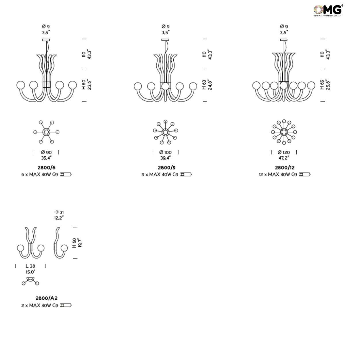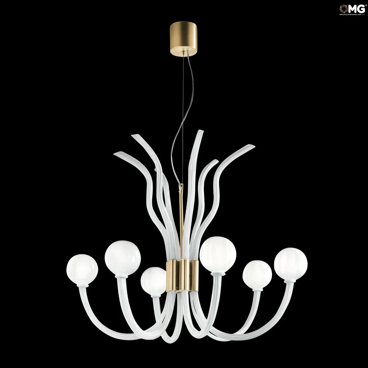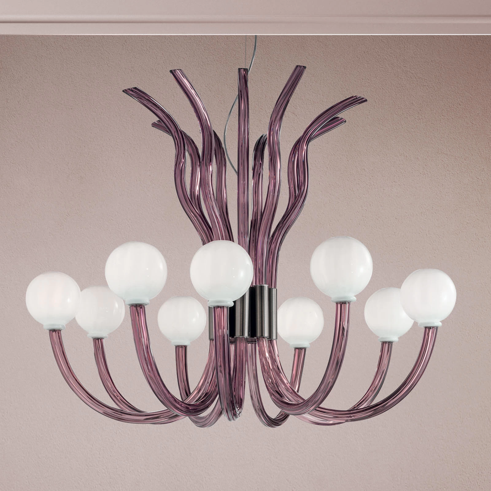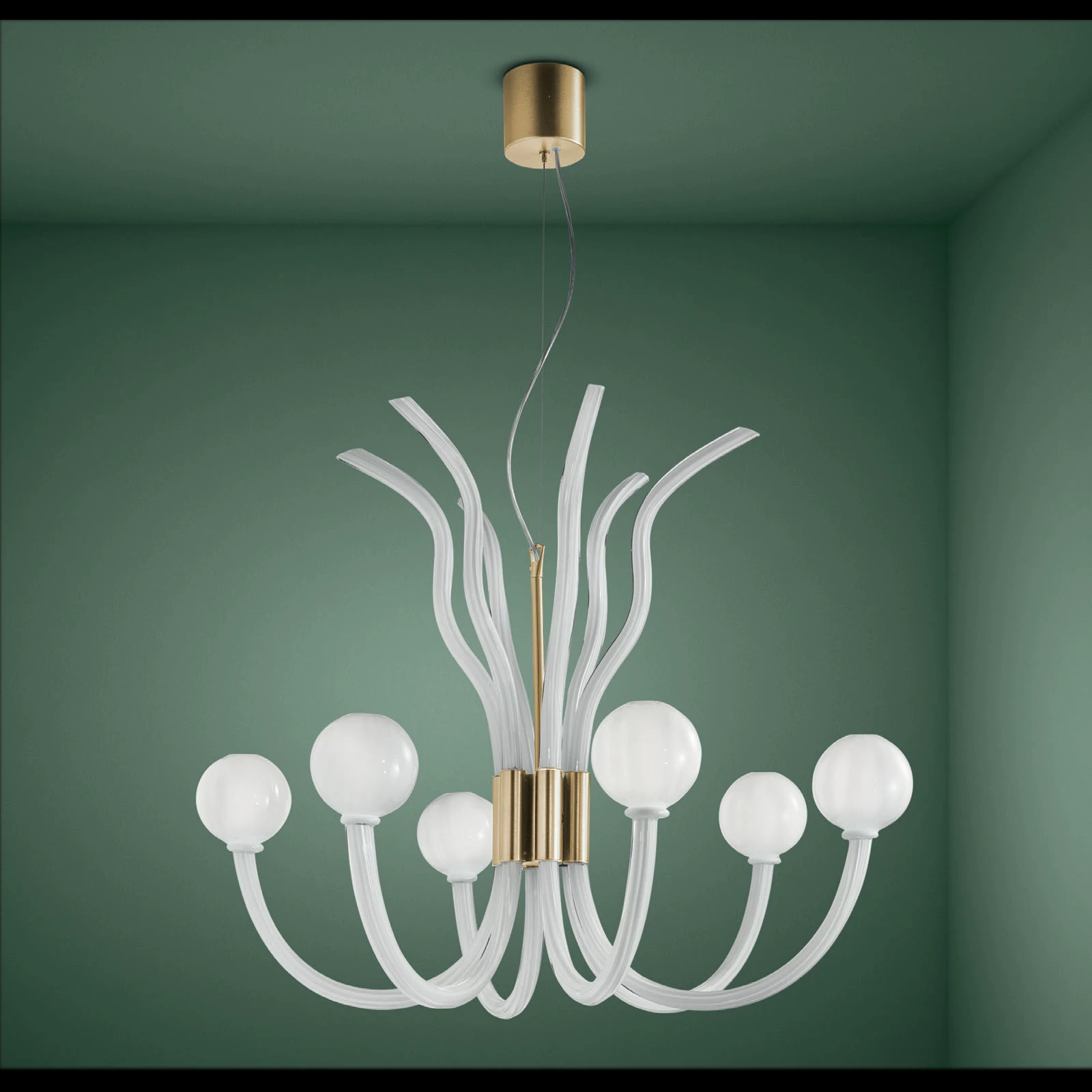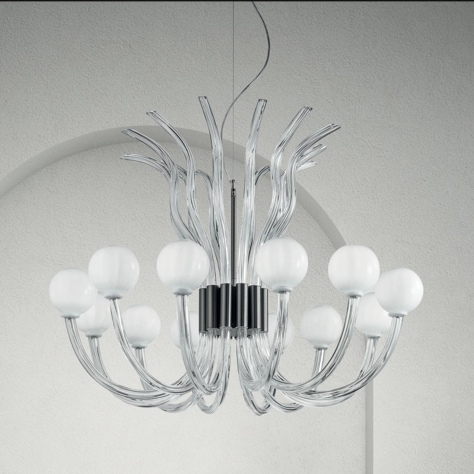 Procida is the result of a romantic design replicating the contours of the main parts that compose and exemplify a classic Venetian chandelier in Murano glass according to a continuous geometric outline