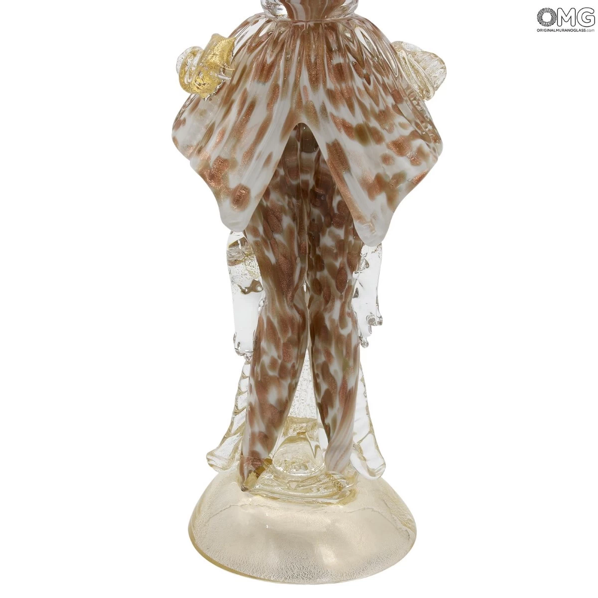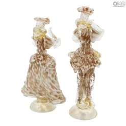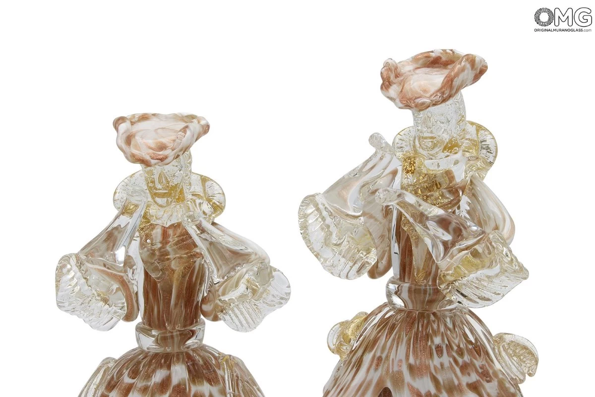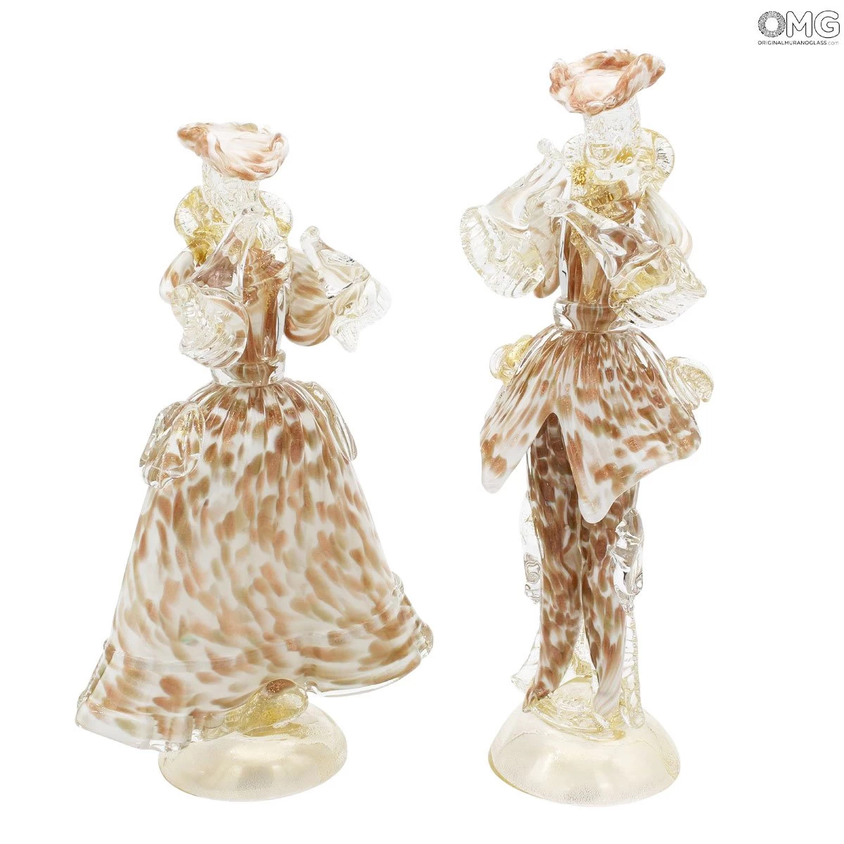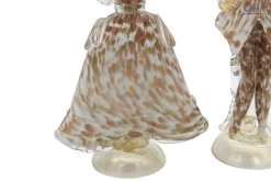 Beautiful Goldoni couple, sculptures made with the tecnique of warm glass modellation and gold decorations. Very stylish couple full of harmony and color, perfectly proportioned. Hand made by the master and signed with cold engraving.