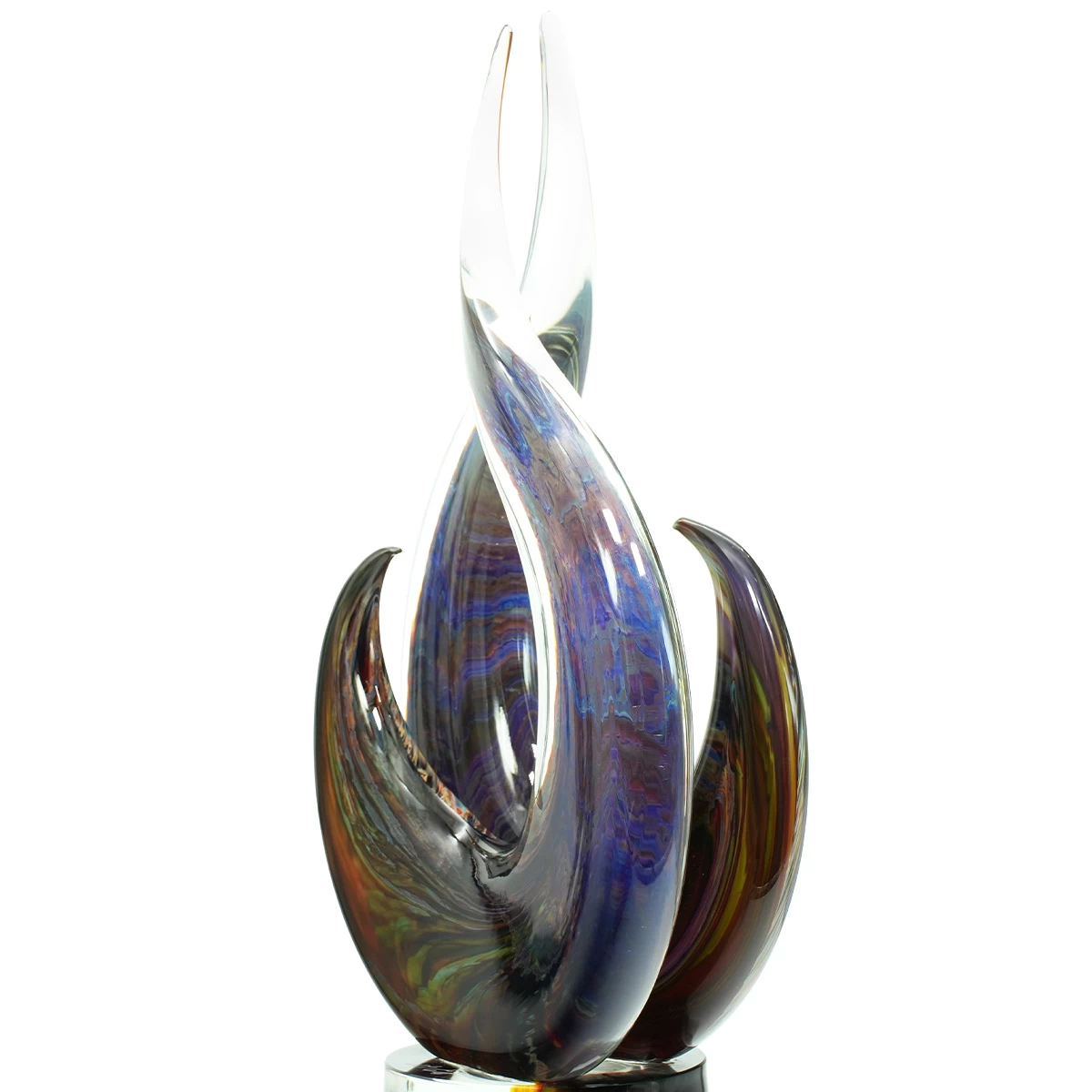 Particularly difficult to realize, chalcedony glass has the peculiarity of joining the canonical glass sphere with silver salts and other coloring oxides: this extraordinary chemical process, coupled with the talent of the Masters of Murano, allows the creation of wonderful works in which an opaque background is streaked with enchanting warm and dark shades, a real turbine of lights and shadows capable of ravishing even the eyes of the most experienced observer.