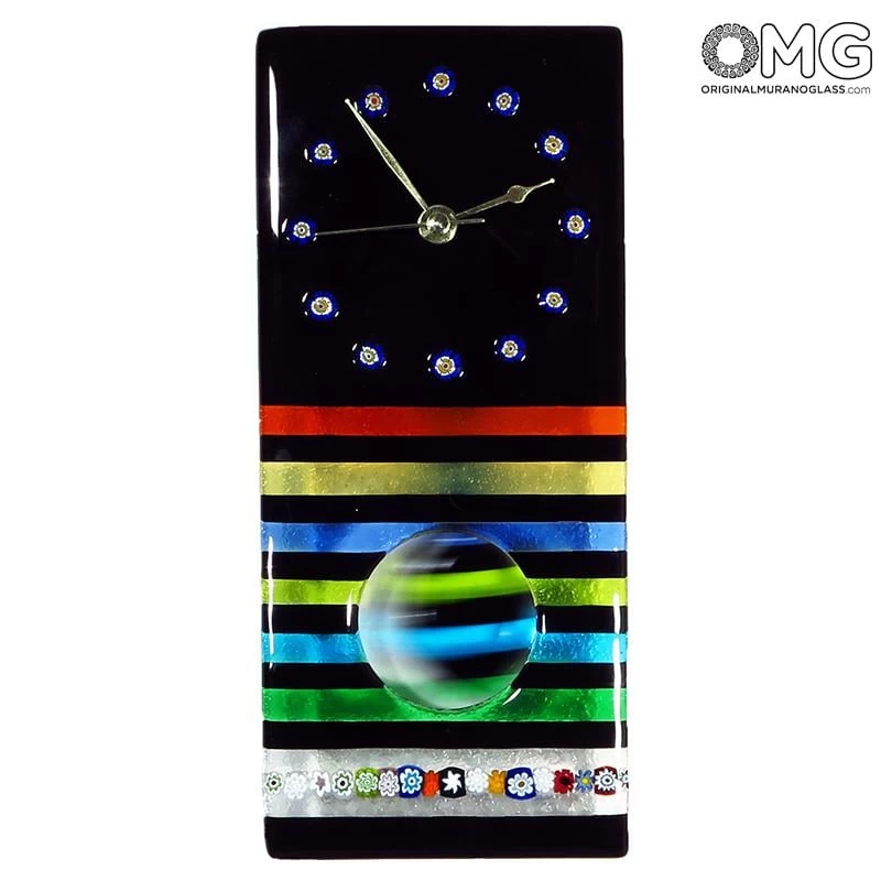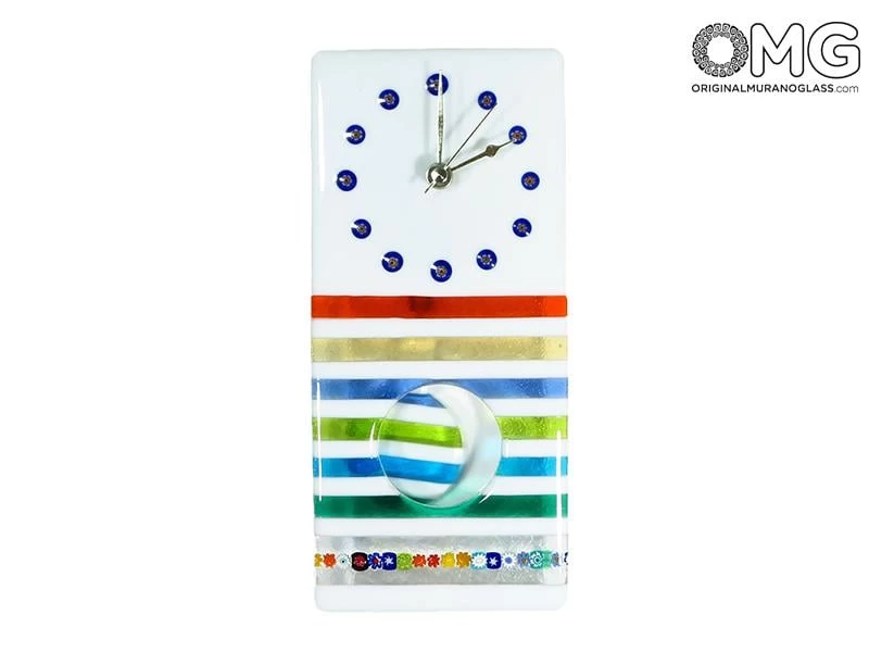 Colorful pendulum wall clock made with glass fusing technique and millefiori. Perfect art work to give a touch of cheerfulness to your house or office. Lovely also as gift idea for an useful and funny present.