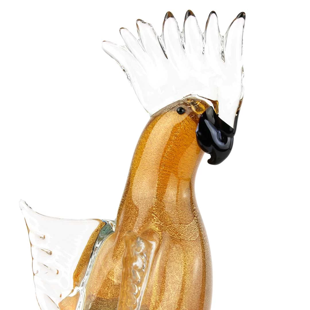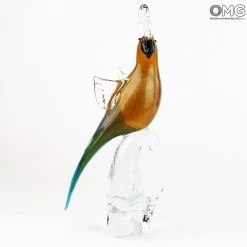Sinuous sculpture of parrot in red with real pure gold leaf on crystal base, worked free hand in solid glass with the glass working techniques in Murano. This lovely sculpture, extremelly elegant, is the perfect artwork for a luxury shelf or to complete your rich furniture.