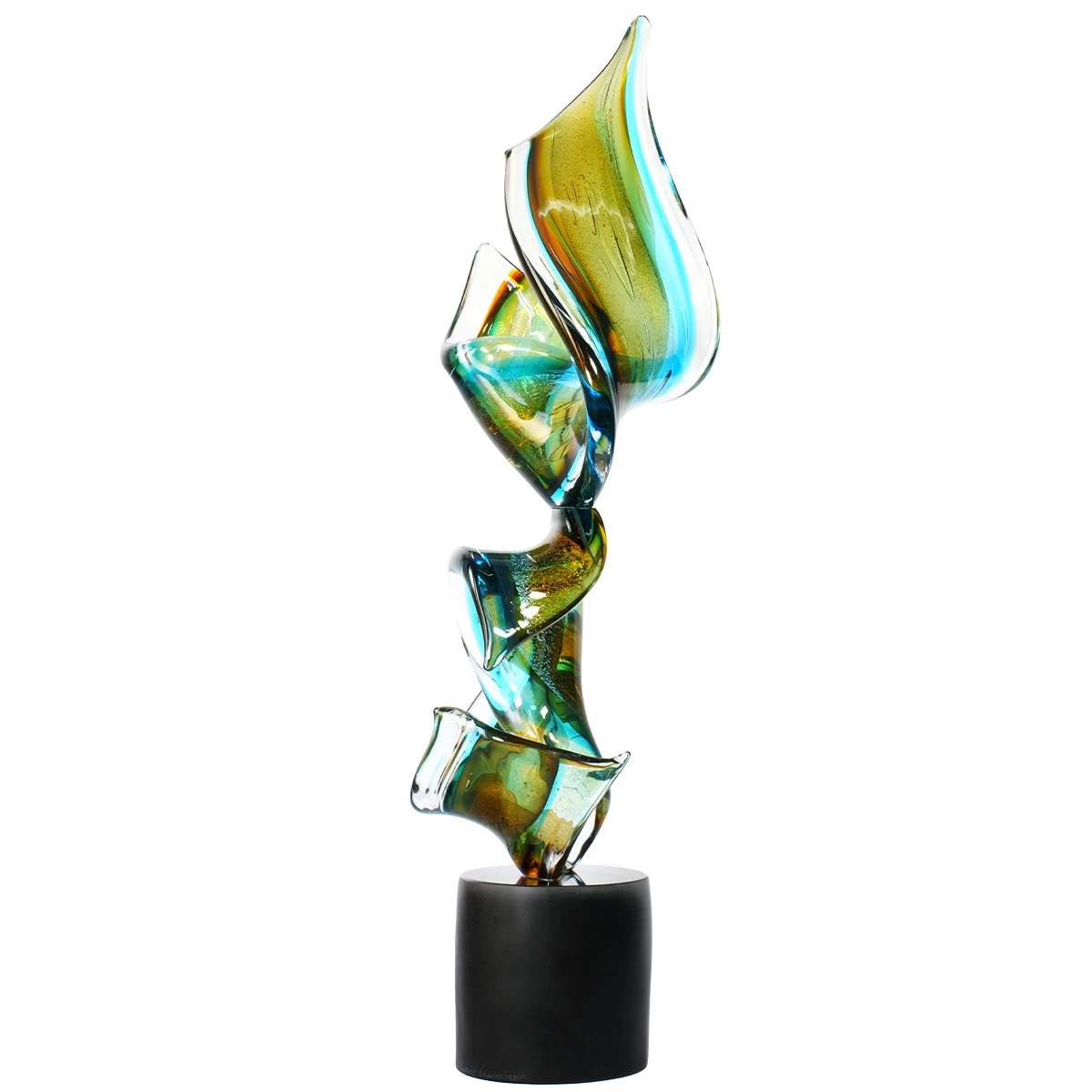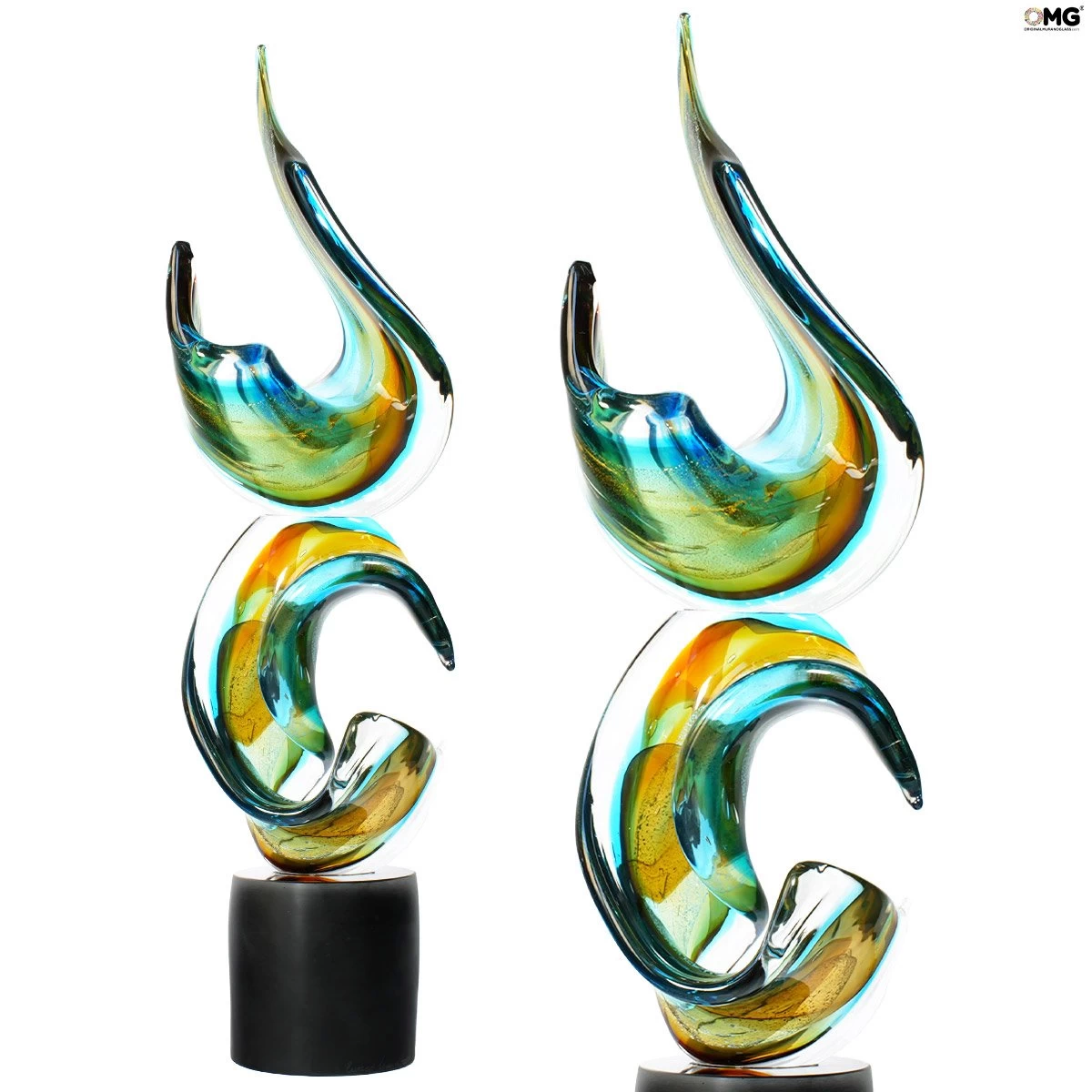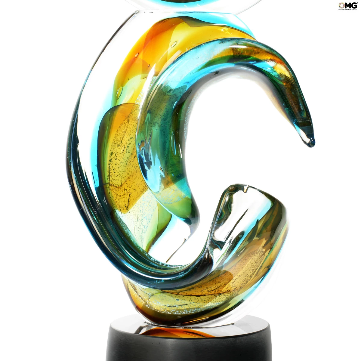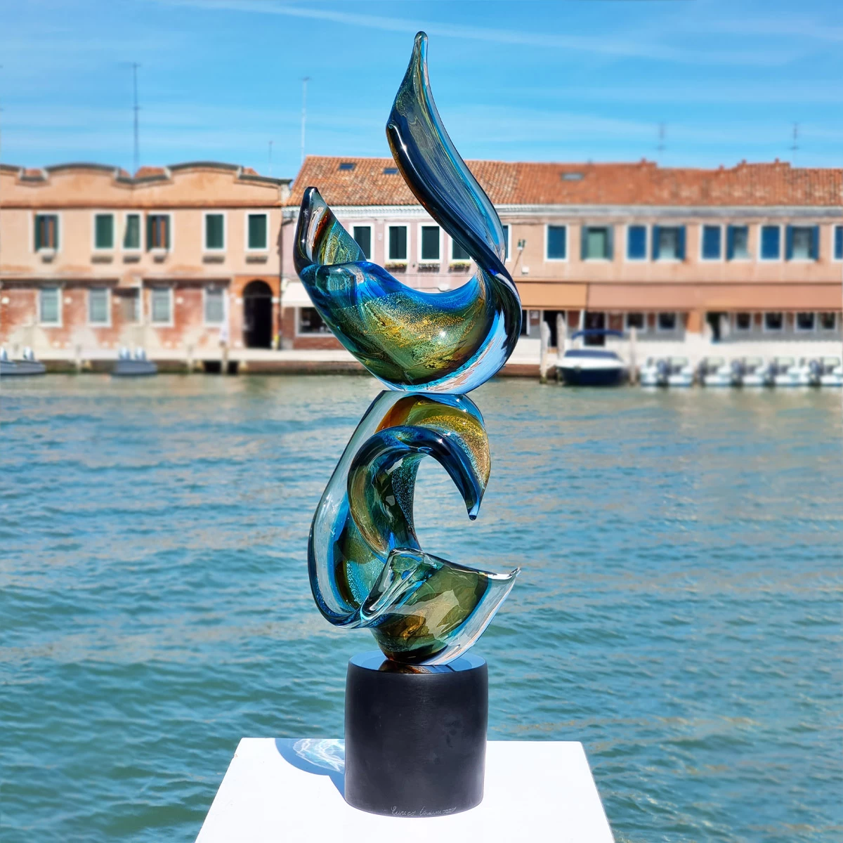 Colorfull Strip sculpture in multicolor glass gold leaf 24 kt hand-worked with black base. This big venetian glass sculpture impresses with its sinuous geometries and the liveliness of its colors. It lends itself perfectly to decorate various environments, from the living room to the study. It can be hosted on an important table or it can be comfortably placed on the ground to decorate the whole living room, hotel hall, office or any exclusive room space.