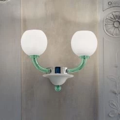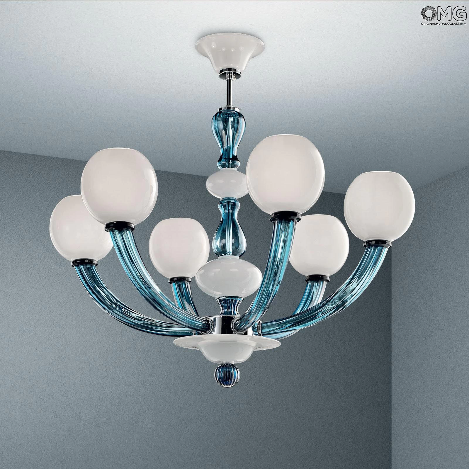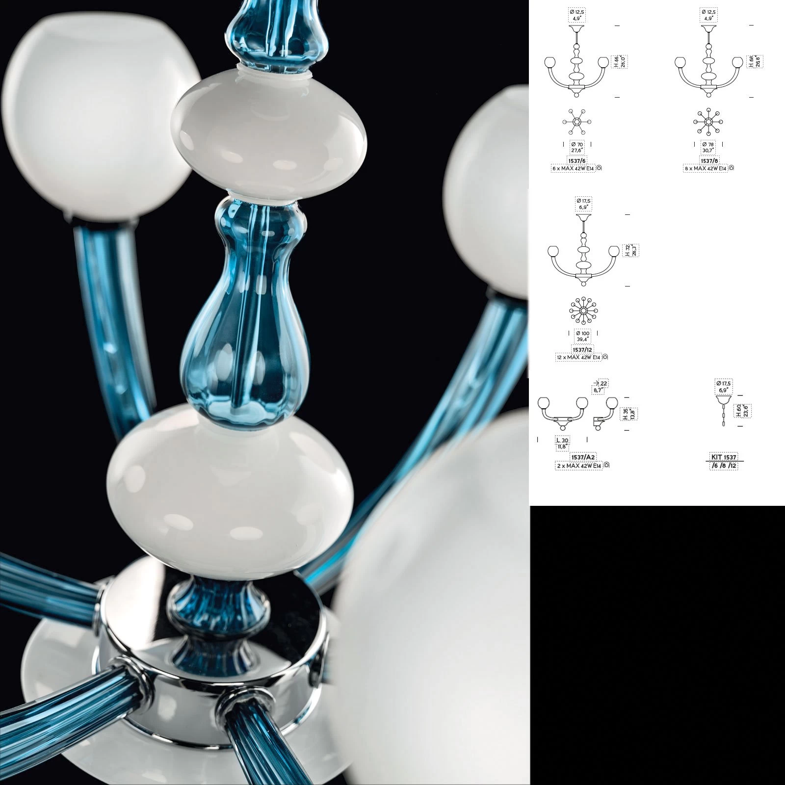 Boccaccio chandeleir offers a reinterpretation of a classic that transfers the art of Venetian glass-making to contemporary interiors where its appealing rounded design creates a warm and welcoming atmosphere. The central part of the chandelier is composed of clear blown-glass elements alternated with elliptical incamiciato blown glass globes. The smooth surfaces of the globes of the cups create a lovely contrast with the branches and elements crafted with the rigadin technique. Boccaccio is proposed in Denim blue and Grey combined with chrome-plated metal details. The range also includes a precious version created with 24 carat gold, applied while the glass is hot, and gold-plated metal details.