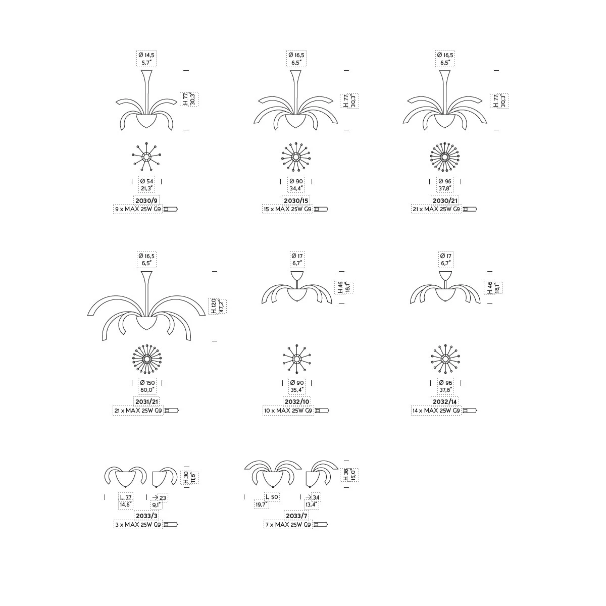 An appealing, functional design with vibrant outlines suited for all types of interiors. The curved, opaque or clear-glass branches extend the from glass-coated metal cups and project the light into various directions, creating an enchanting atmosphere in the room.