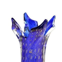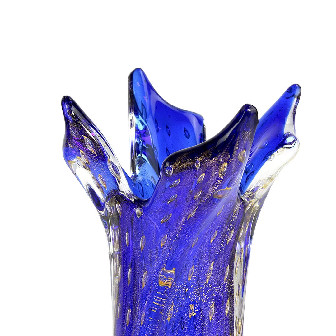 The folded glass bowl has a flower artist design with a vibrant blue color and pure gold 24kt. The amazing controlled pattern of bubbles was achieved by the bullicante bubbled technique .