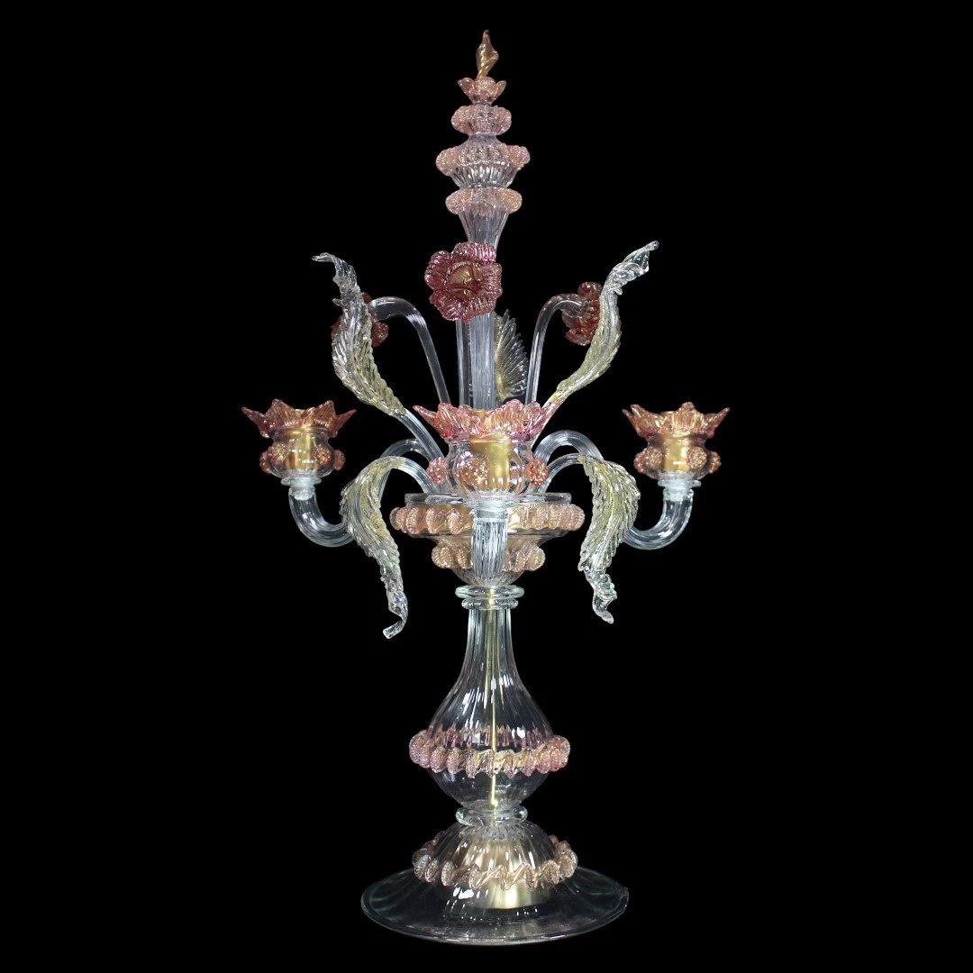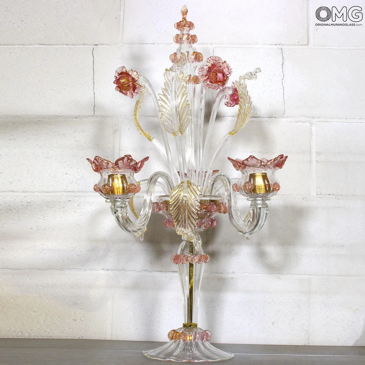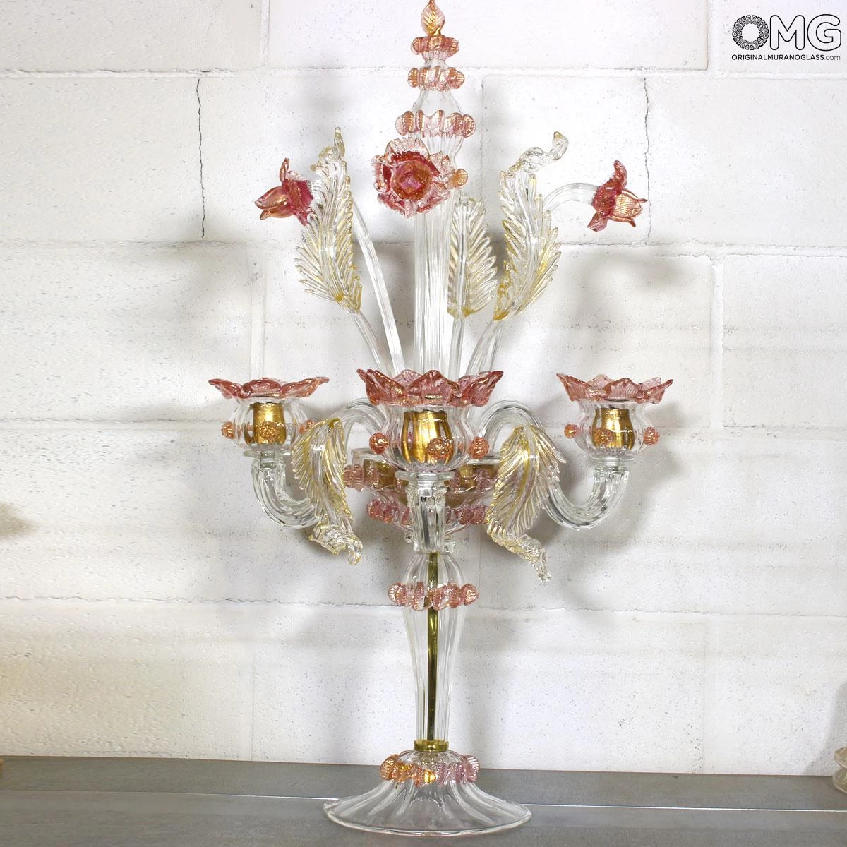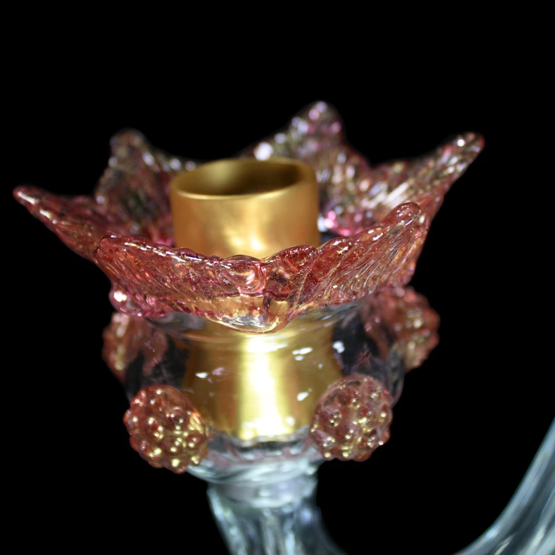 Flambeau 3 lights, Venetian glass transparent with pink trim and gold. Flambeau handmade according with the old Murano glass tradition, handcrafted in blown glass.Â