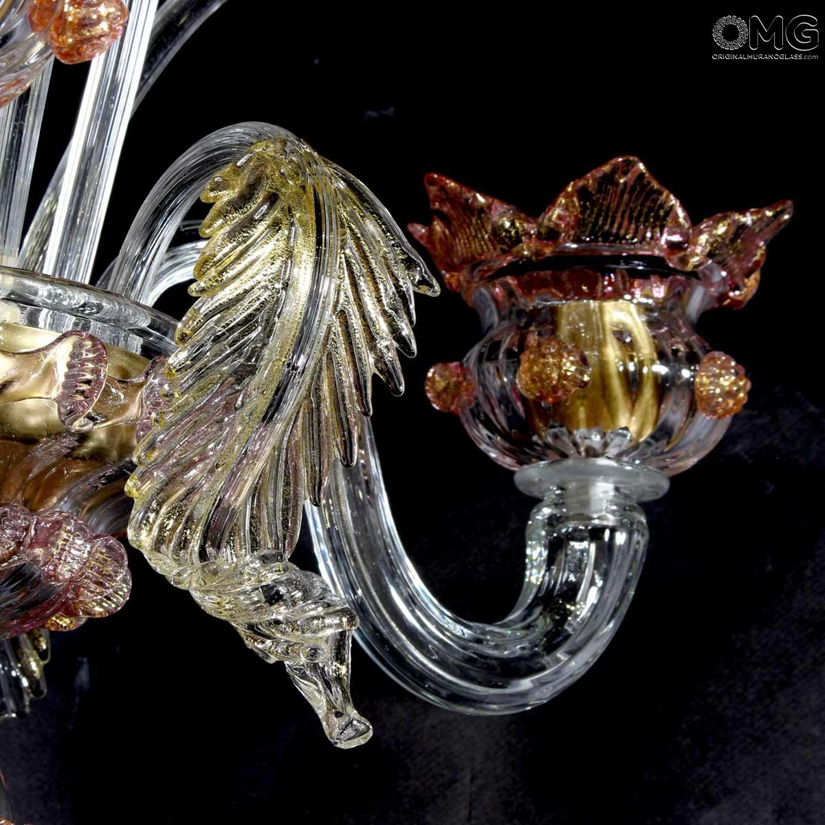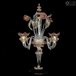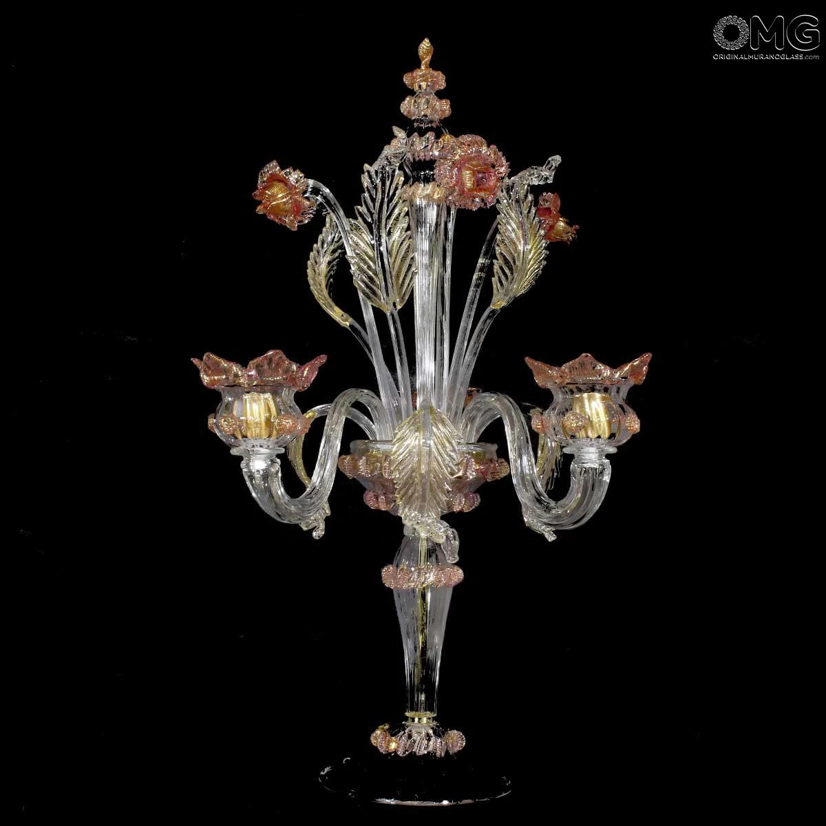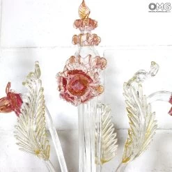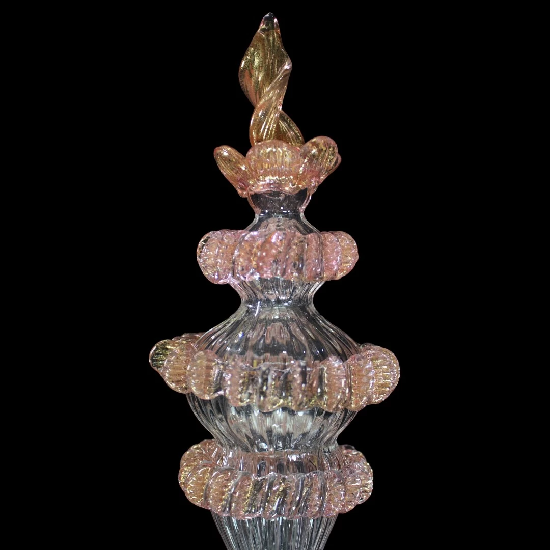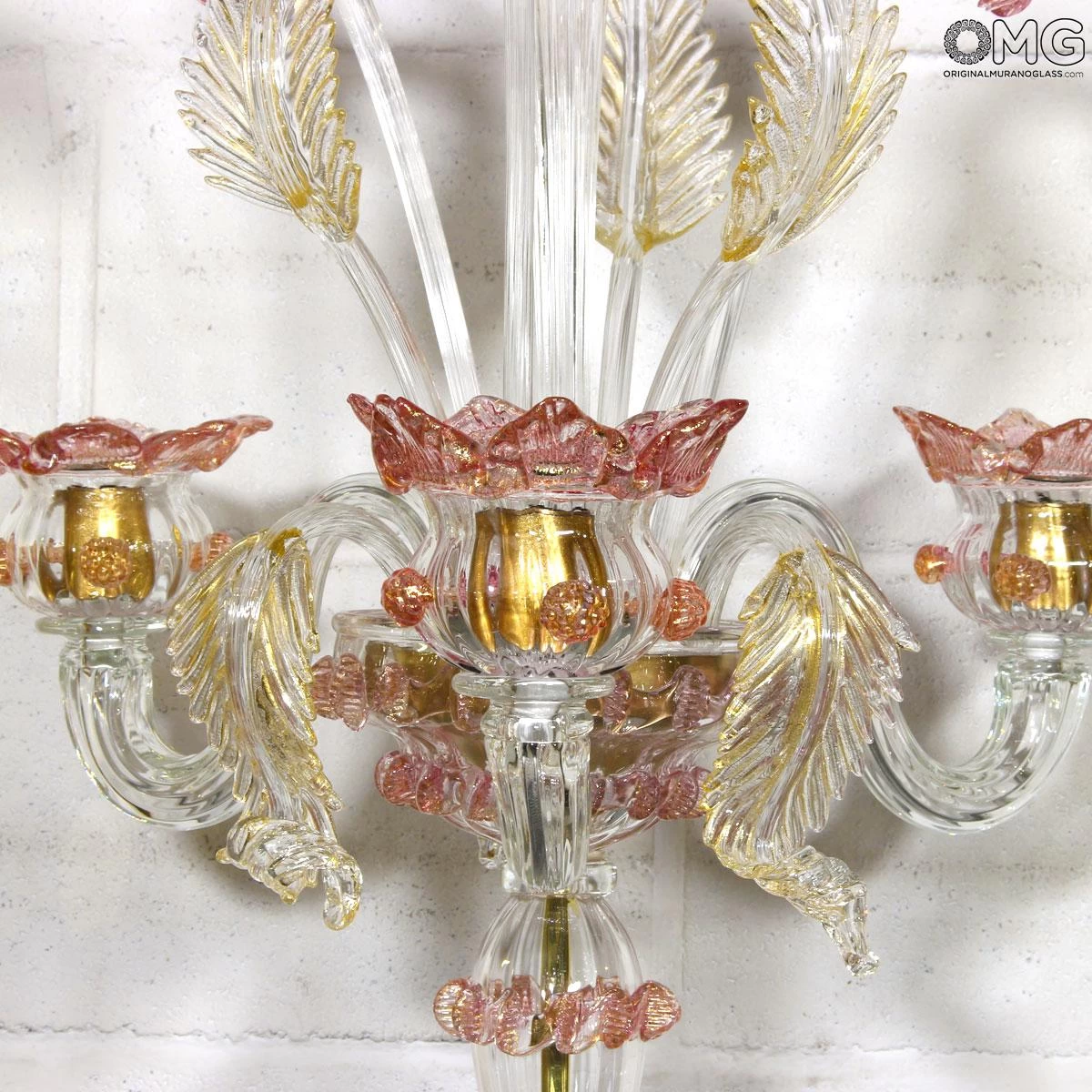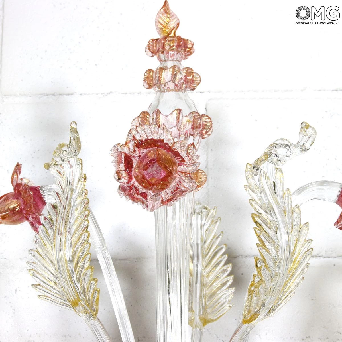 Flambeau 3 lights, Venetian glass transparent with pink trim and gold. Flambeau handmade according with the old Murano glass tradition, handcrafted in blown glass.Â