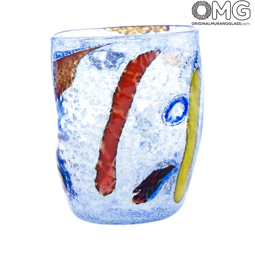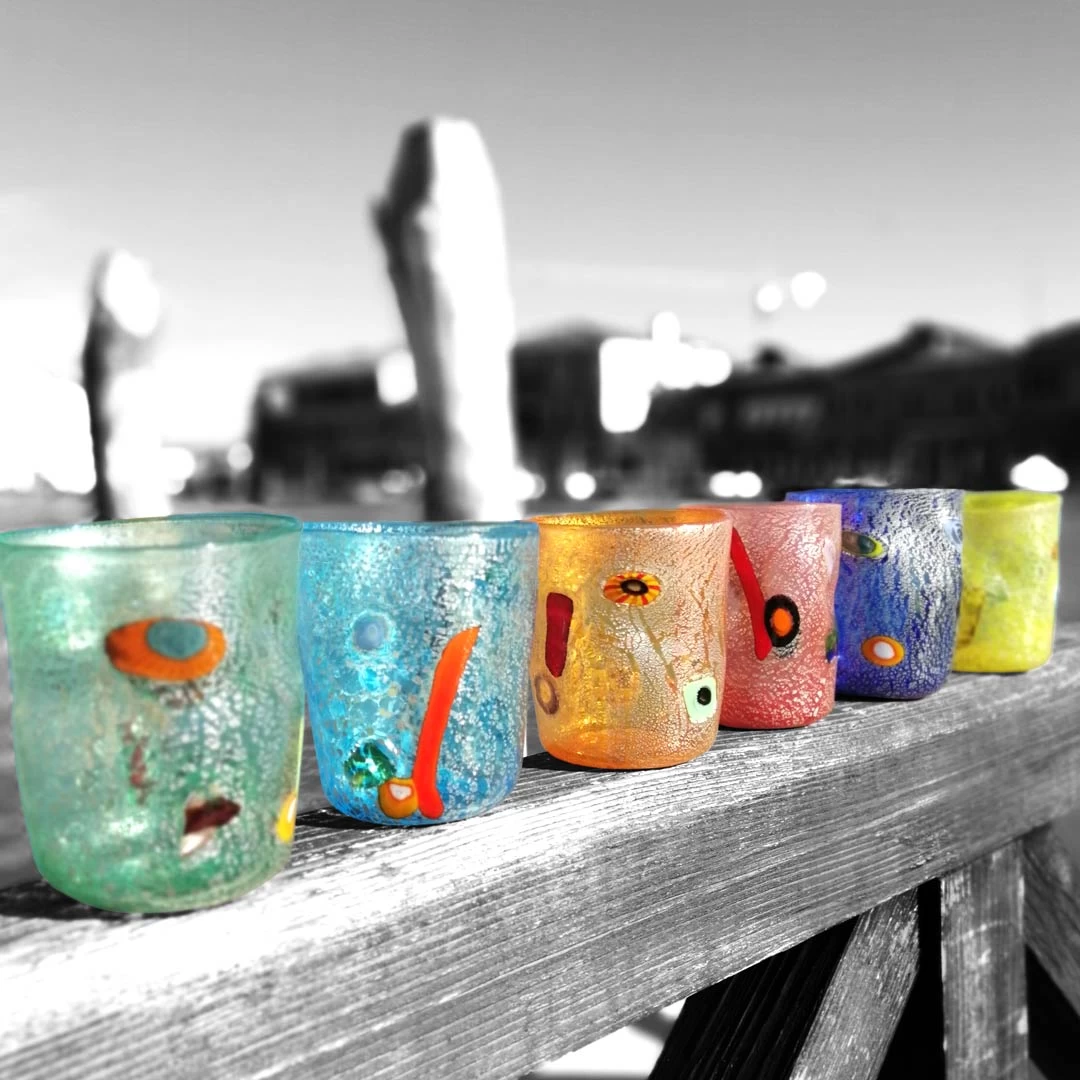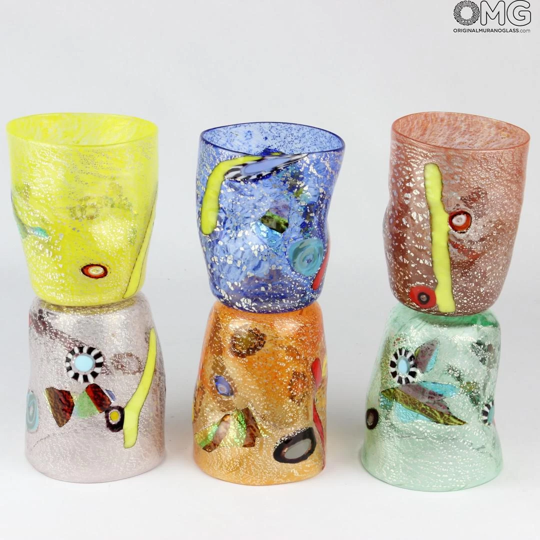 Cool set of 6 drinking glasses blown with silver, millefiori, and polychrome millefiori canes. Perfect to impress your guests while serving a good wine, a cocktails or simply water. These are the famous “Goto da fornase”. The tradition says Glass Masters used to drink in this kind of cup during working time in Furnace. All items are handmade and unique. Note: the set is always differents of the one in photos, we do not use stamps, and colors are mix and random texture for each piece.