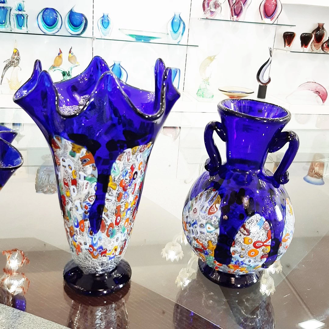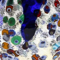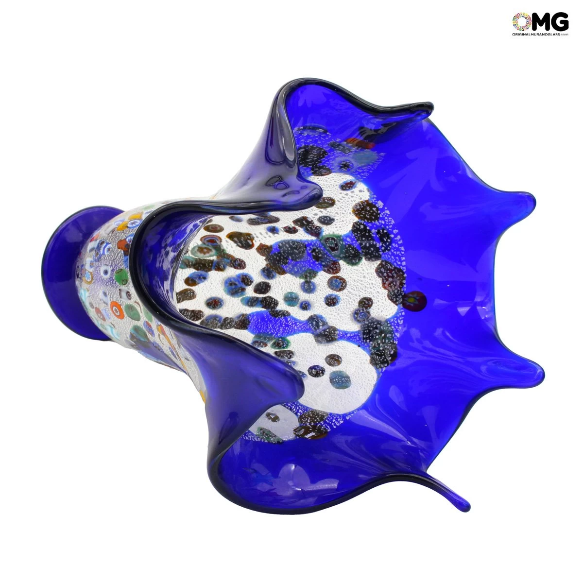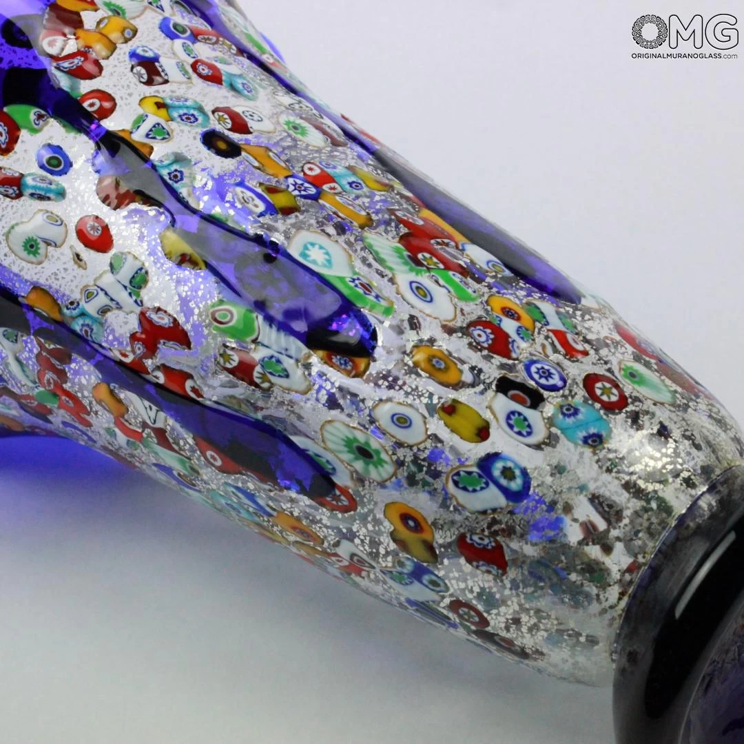 Vase made with the technique of blown glass, decorated with silver leaf and colorful variegated murrine.