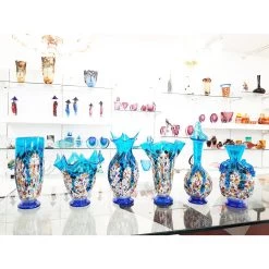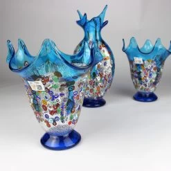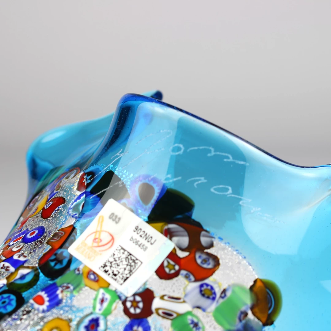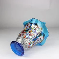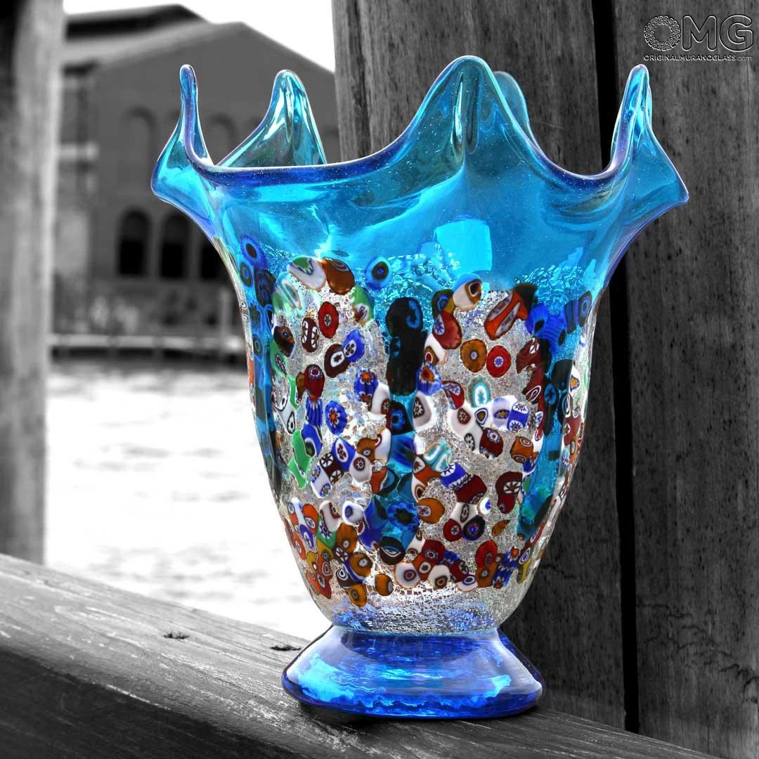 Vase handmade with the technique of glass blowing with silver and murrina milelfiori decoration.
