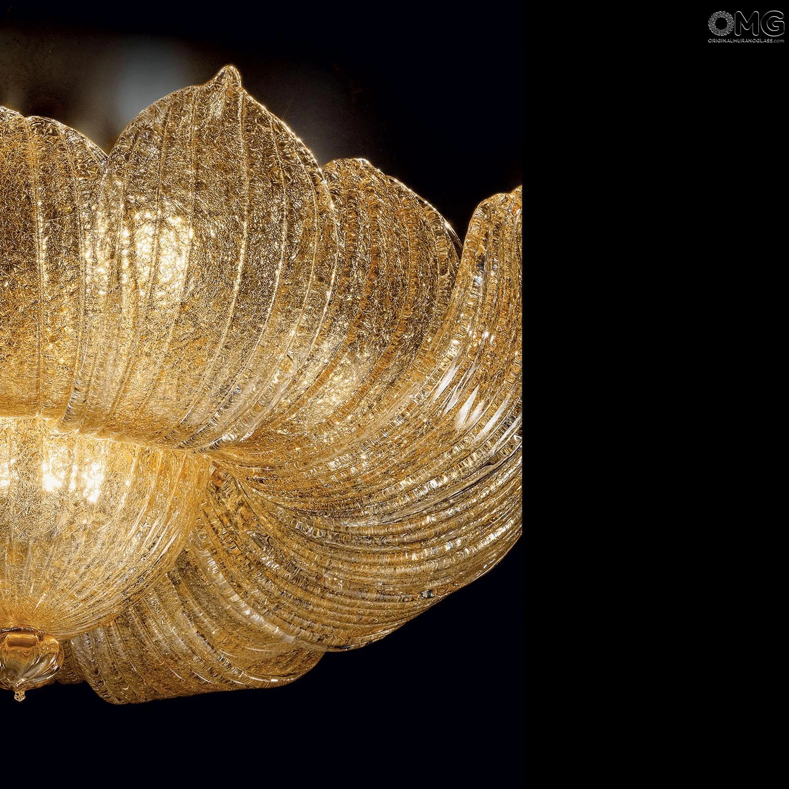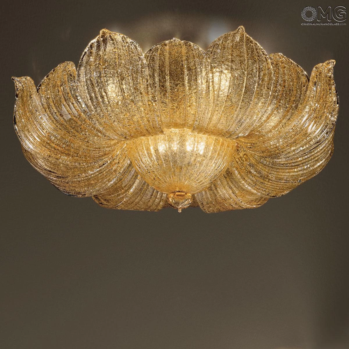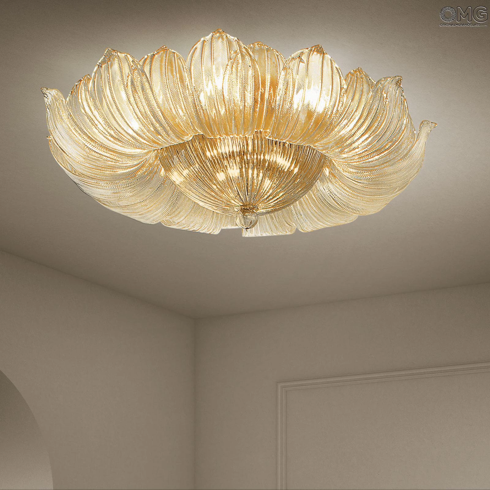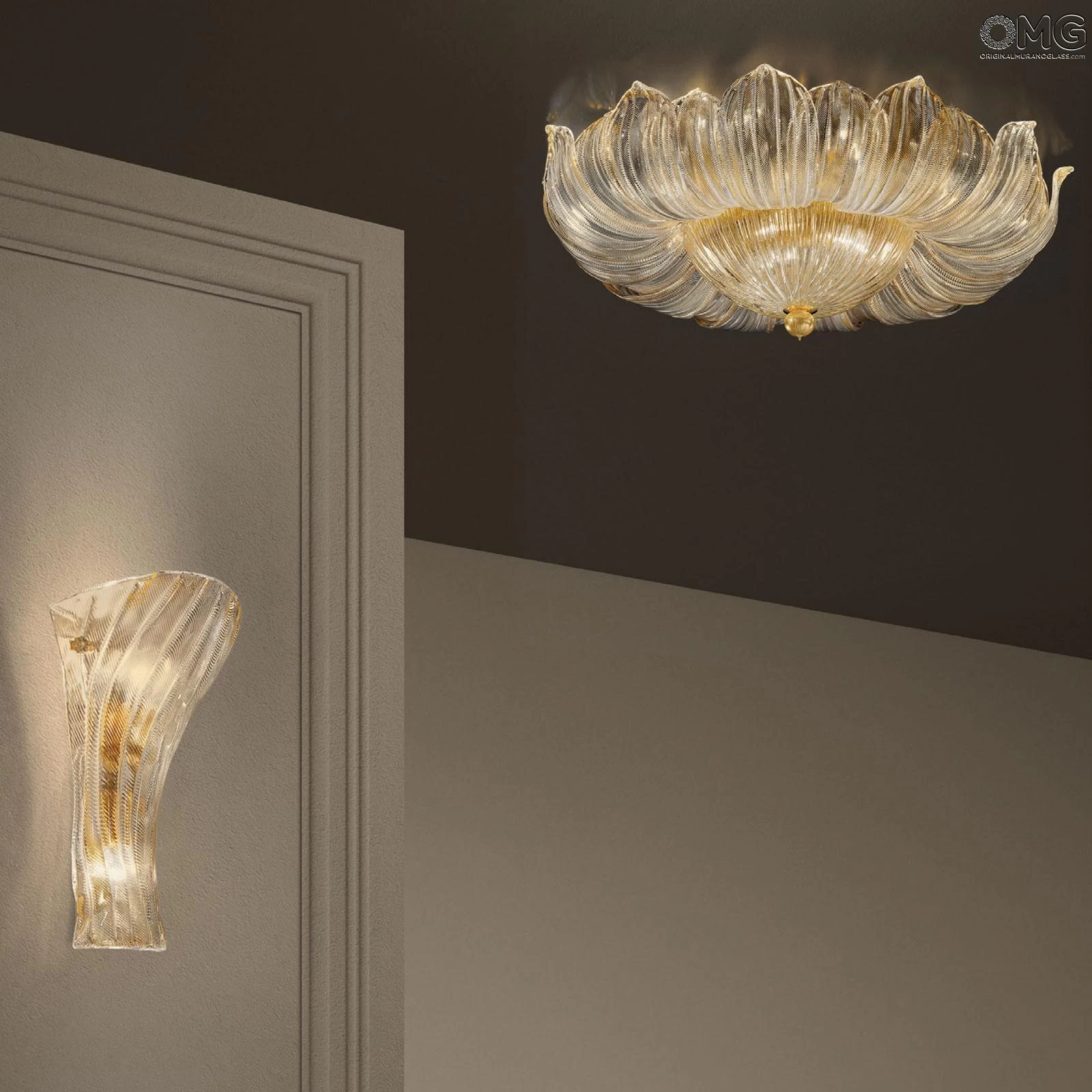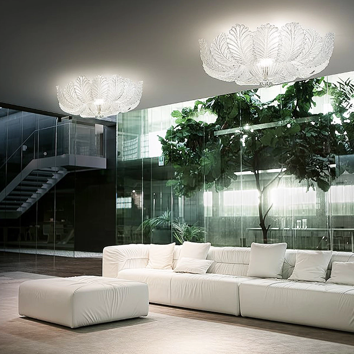 Walls and ceilings take on a unique look with Mina whose large petals are odorned with elegant patterns impressed on the glass while hot (a caldo technique). The concealed source of light floods through the texture highlighting Mina’s lovely curvilinear design. The components are proposed in floral or geometric finishes that allow the fixtures to suit both classic and contemporary interiors.