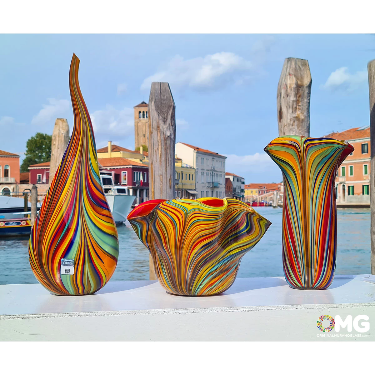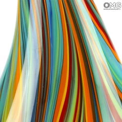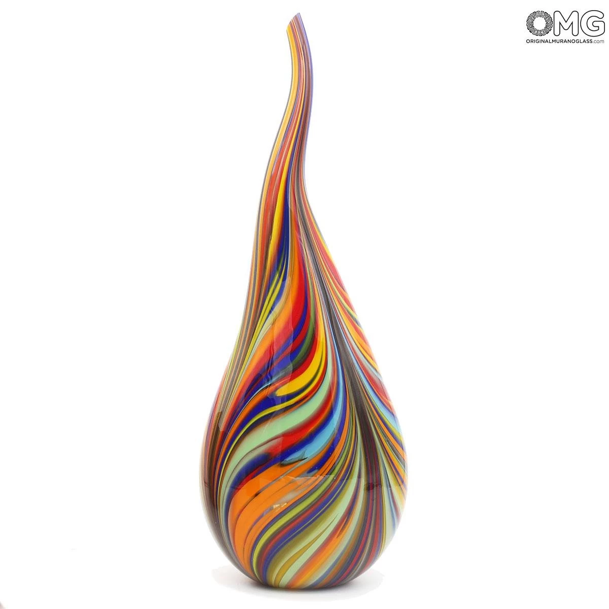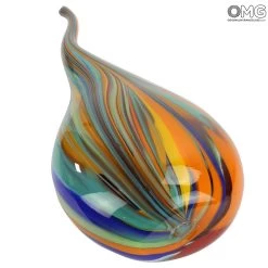 This vase is part of our great glass collection called Missoni, the venetian vase has a drop shape and it is perfect for any home decor, perfect for modern design, the color is shining multicolor glass. The composition of the surface effect color is always different in each piece, the colors used are little glass pieces in green, yellow, blue, red, orange molten togheter to give a perfect combination of mixed glass colors. This is a new collection of only 10 pieces, one of a kind.