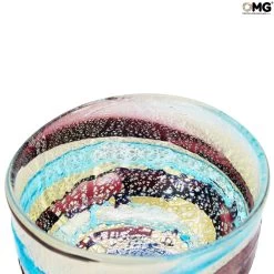 Than some colored glasses are blown over the vase to give color and to prepare the embellishments. Finally these blown glasses are broken and submitted to fusion for a second time.