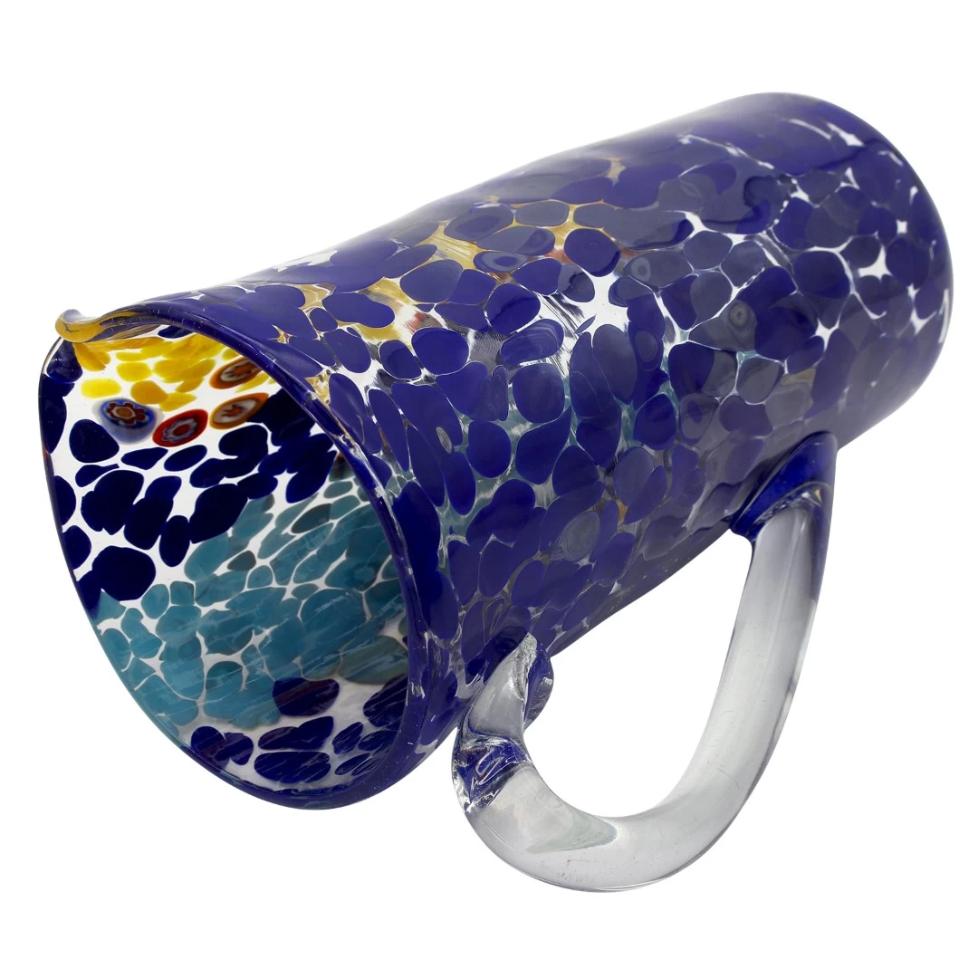 Pitcher in venetian glass handmade with the technique of glass blowing, with multicolored glass spots and millefiori decoration. This original Murano glass vase is signed by the glass master.