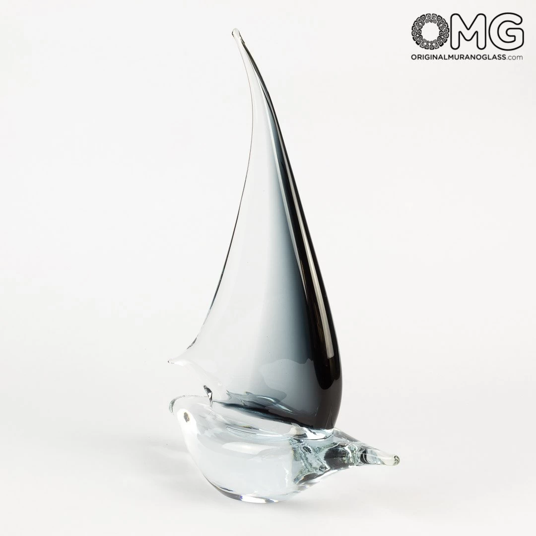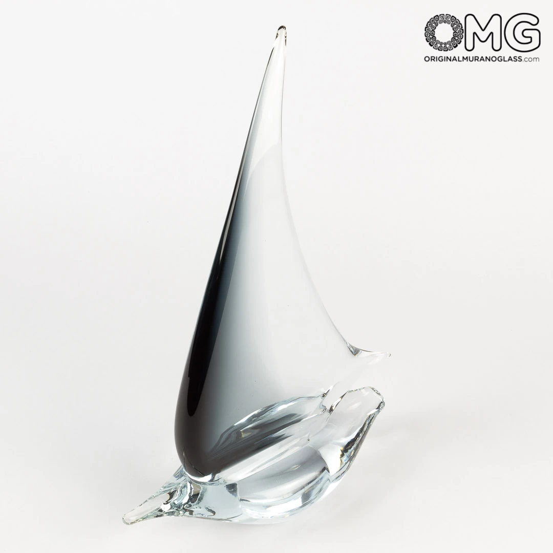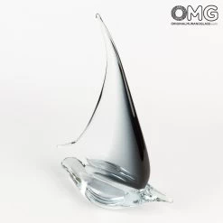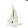 Exclusive and unique glass artwork of a handmade sailing boat in colored glass realized in free hand on a punty in solid glass.
