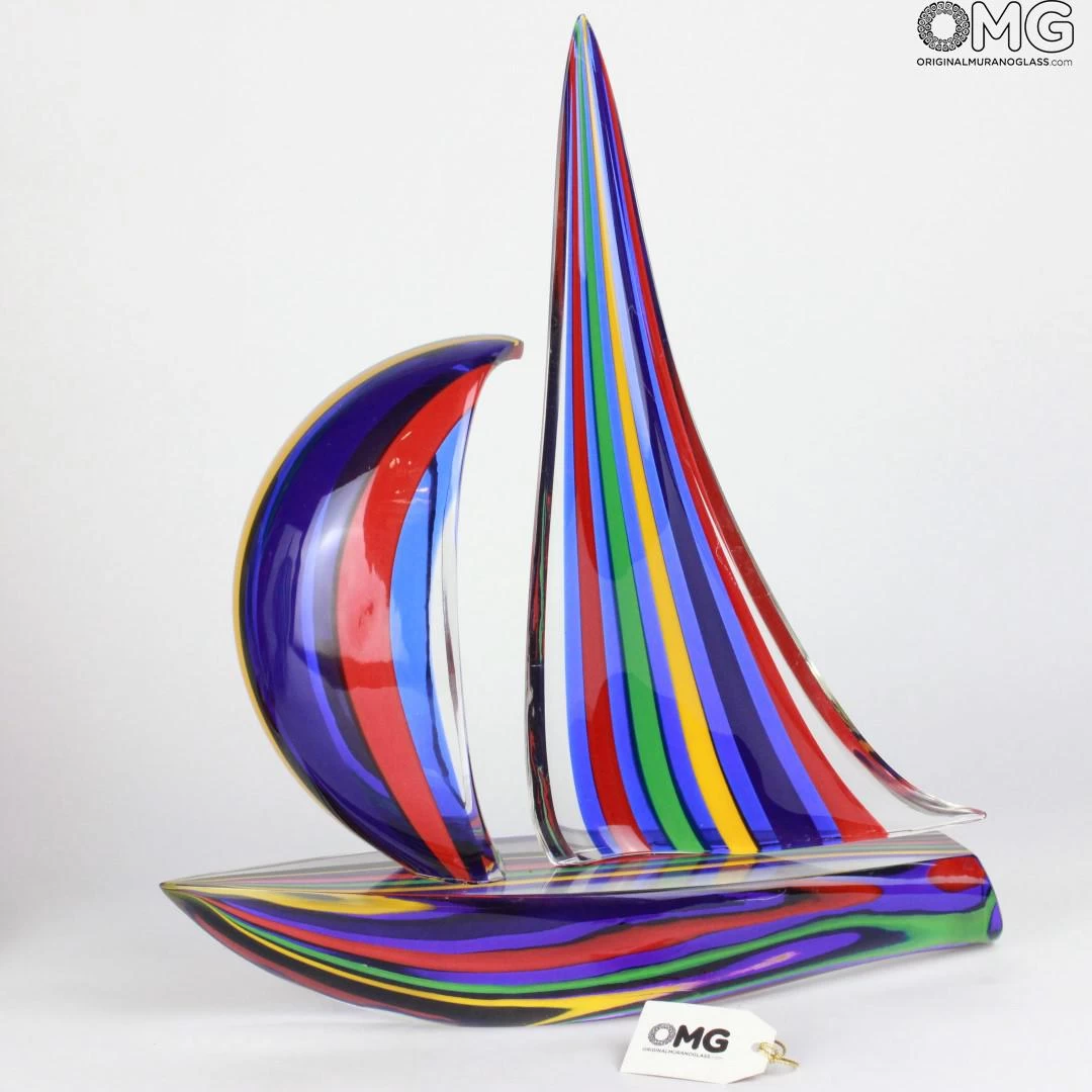 Abstract sail boat sculture perfect to decorate tables or shelves. Our Murano glass sail boat sculpture is a classic of the Murano glass art and are often used not only to decorate houses or office but also as gift, present, throphy for events and competition and in many more differents way. Lovely colors obtained by the use of colored glass canes and filigree.