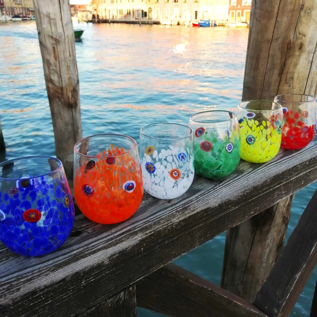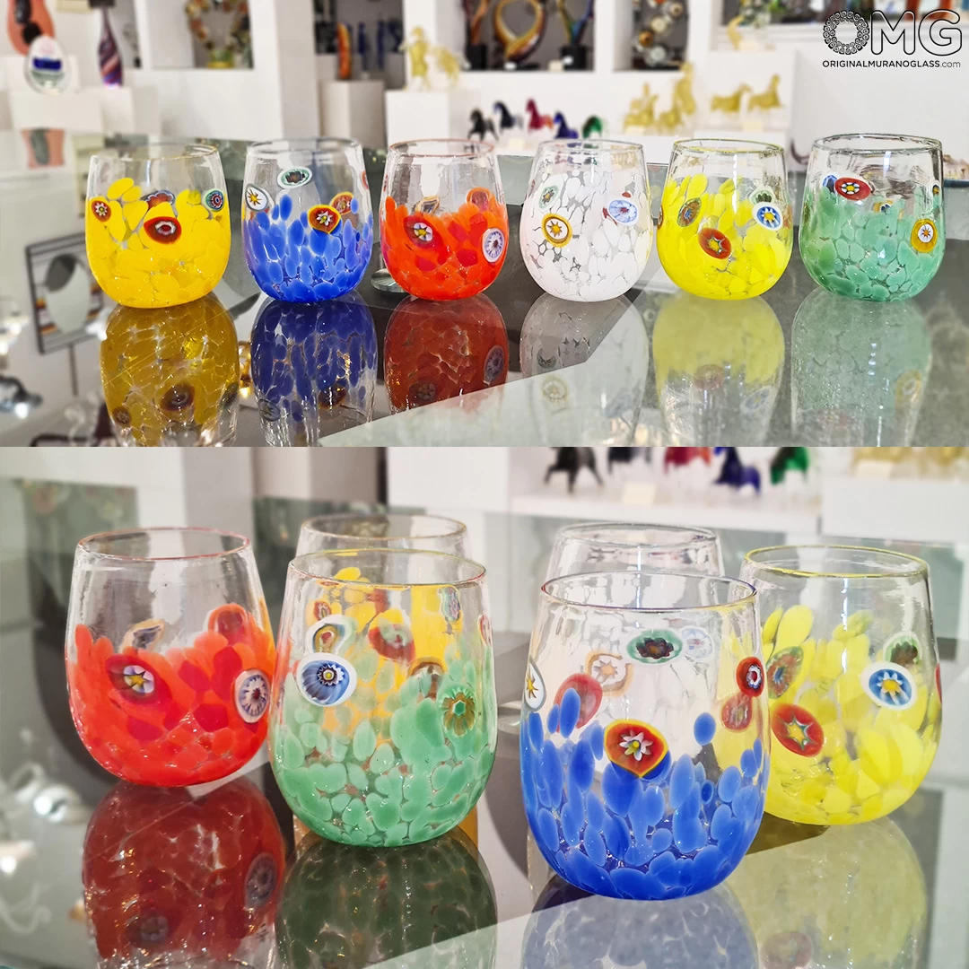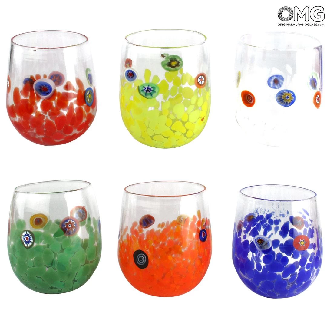 Make your table more colourful with this set of 6 glasses, blown made in Original Murano Glass with glass colored spots.Â