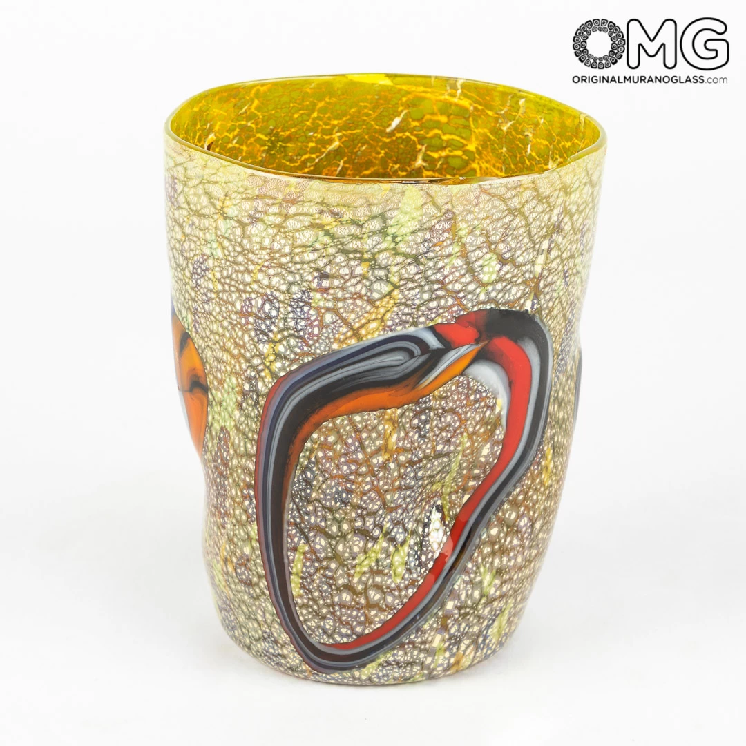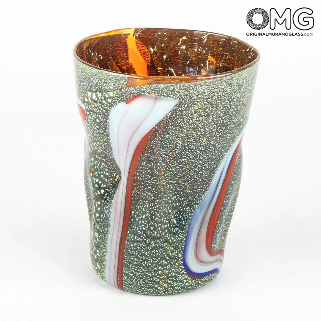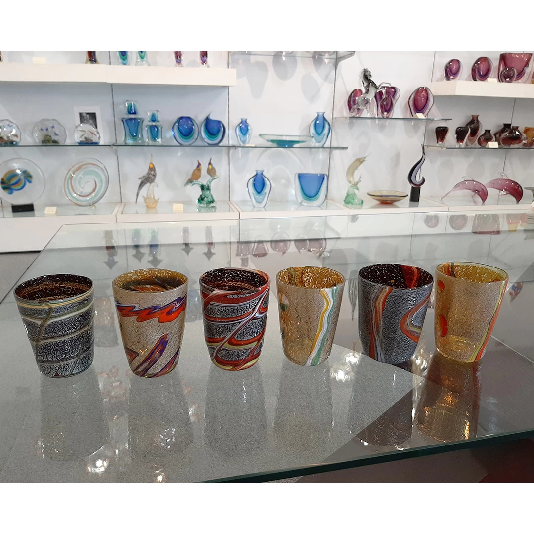 Very nice set of 6 glasses. All items are different, handmade with real silver leaf on a base of colored glass. It is the famouse “Goto da fornase”, the tradition says Glass that glass master uses to drink in Goto during working time in Furnace. Note: the set is always differents from the one in photos, we do not use stamps, and colors are mixed randomly, so murrines texture for each piece can be little different.
