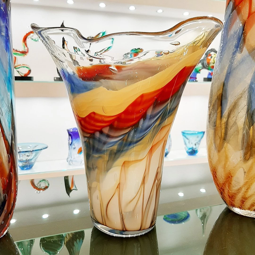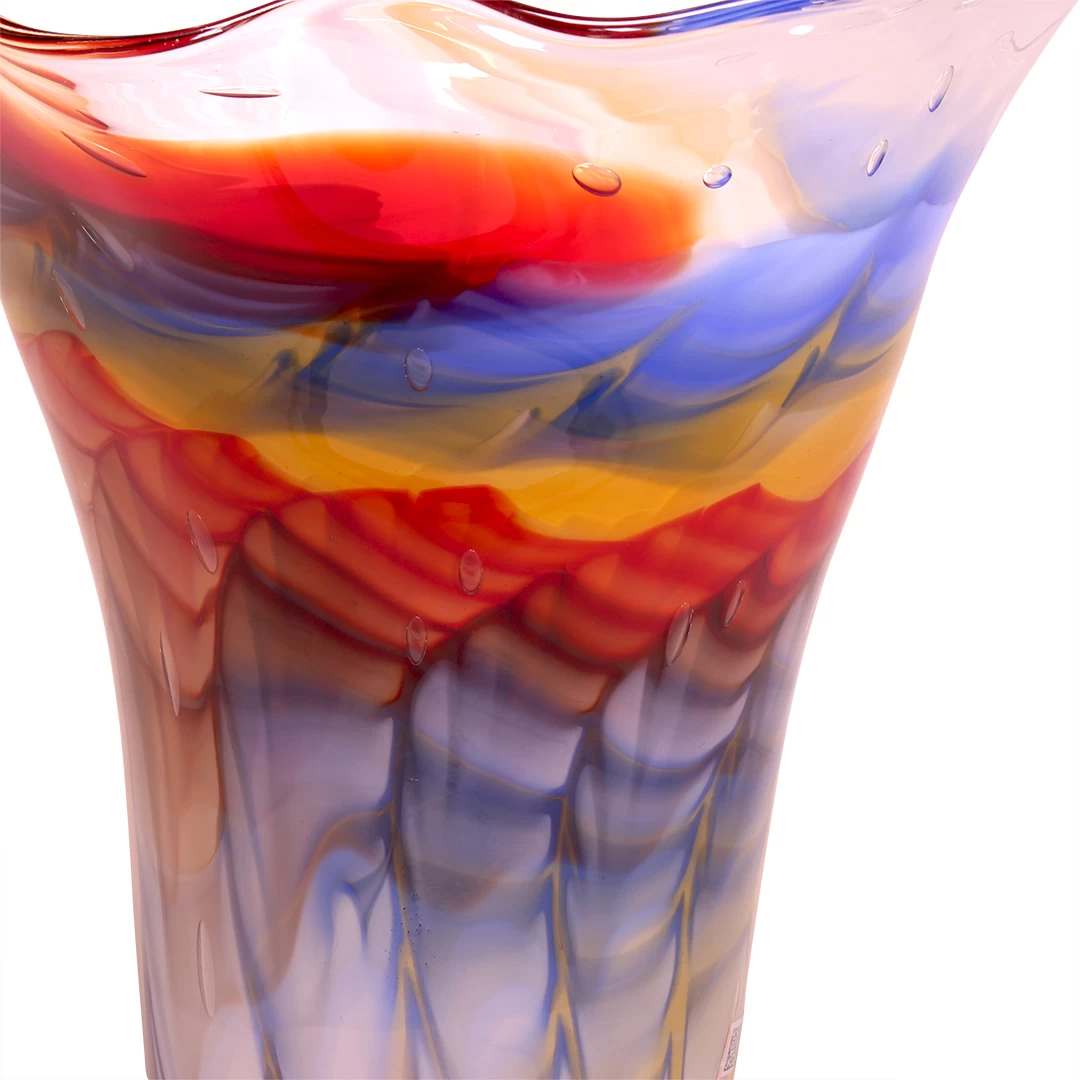 The particular wavy texture and the alternation of colors were carried out by the master glassmaker in a masterly way to create a work of art of easy appreciation but of great scenic impact, ideal for embellishing any environment.