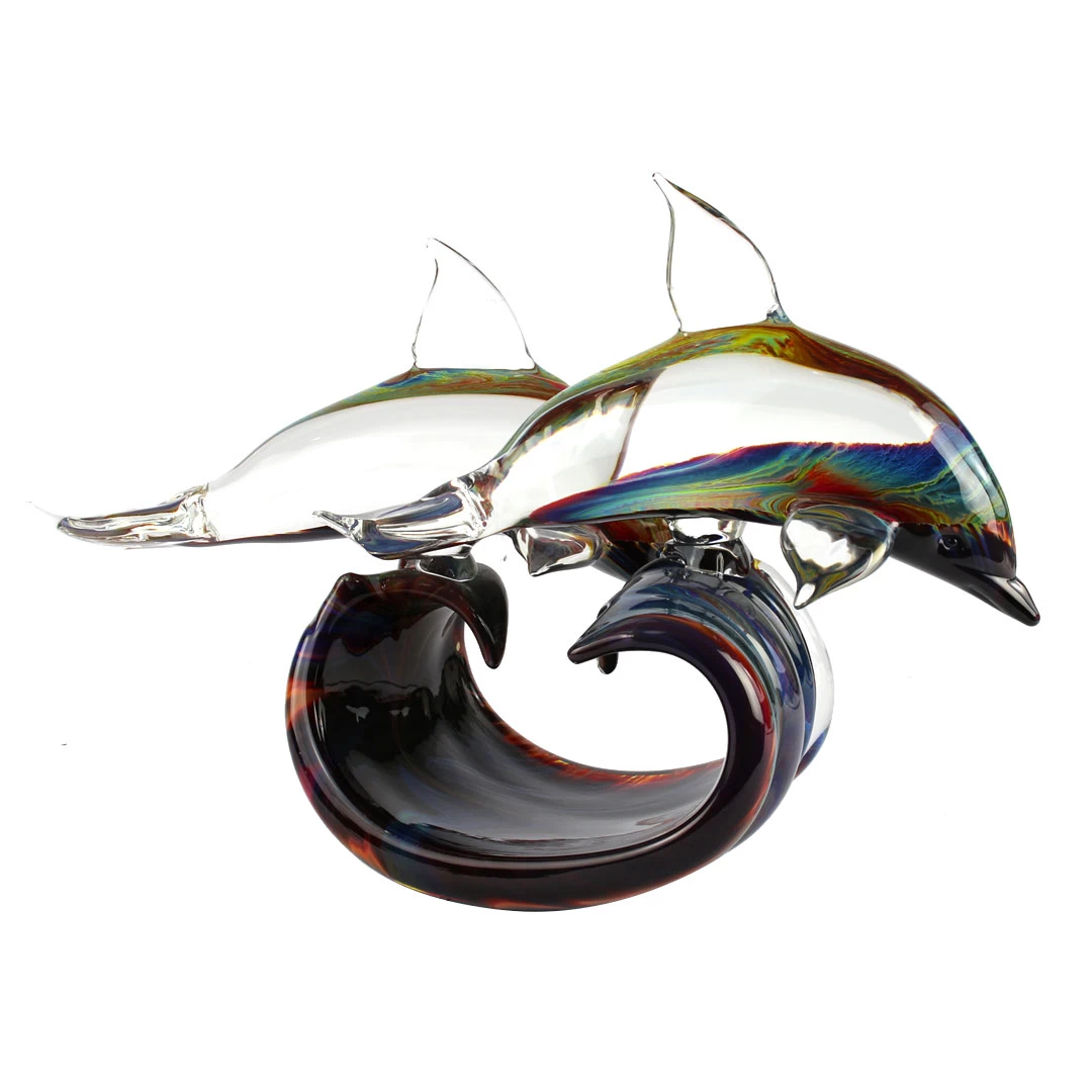 Exclusive and unique glass artwork of two dolphins handmade in clear glass and , realized in free hand on a punty in solid glass. The sculpture is polished and cold glass cut by sandstone.