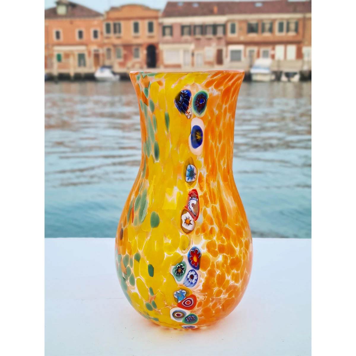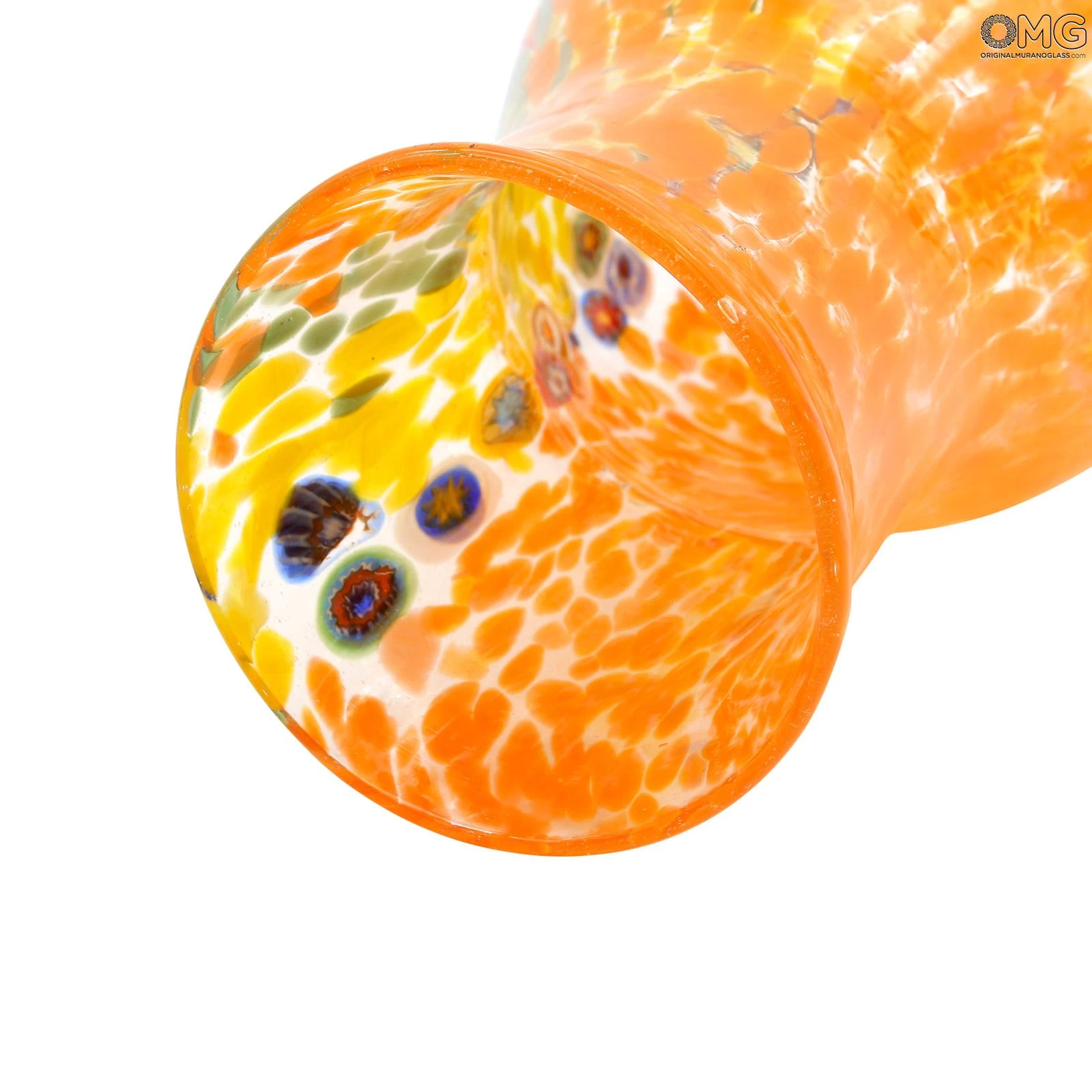 Bowl vase centerpiece in venetian glass handmade with the technique of glass blowing, with multicolored glass spots and millefiori decoration. This original Murano glass vase is signed by the glass master.