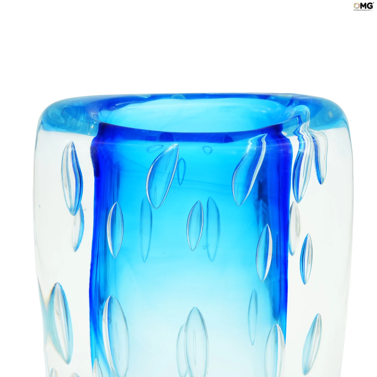 Luxury handmade vase with the famouse technique of glass Sommerso, realized in Murano Glass. A particular decorative effect with “bubbles”, distributed in layers within the thickness of the glass. After cooling down the first part of his piece, the artist condensed the work in the end by using submerged glass, known as the ‘Sommerso’ technique, (made by overlapping different layers of glass with a variety of consistency and colors) .