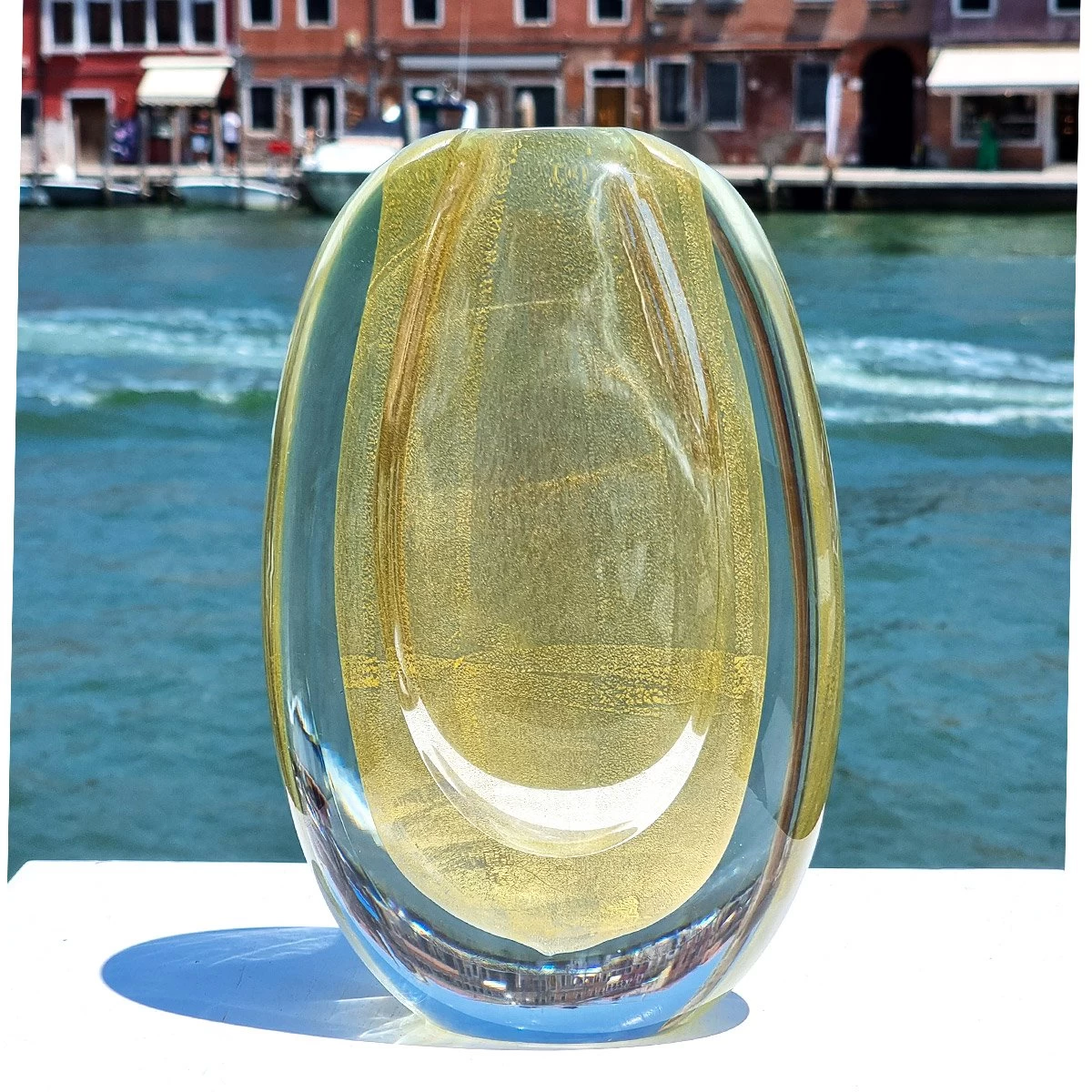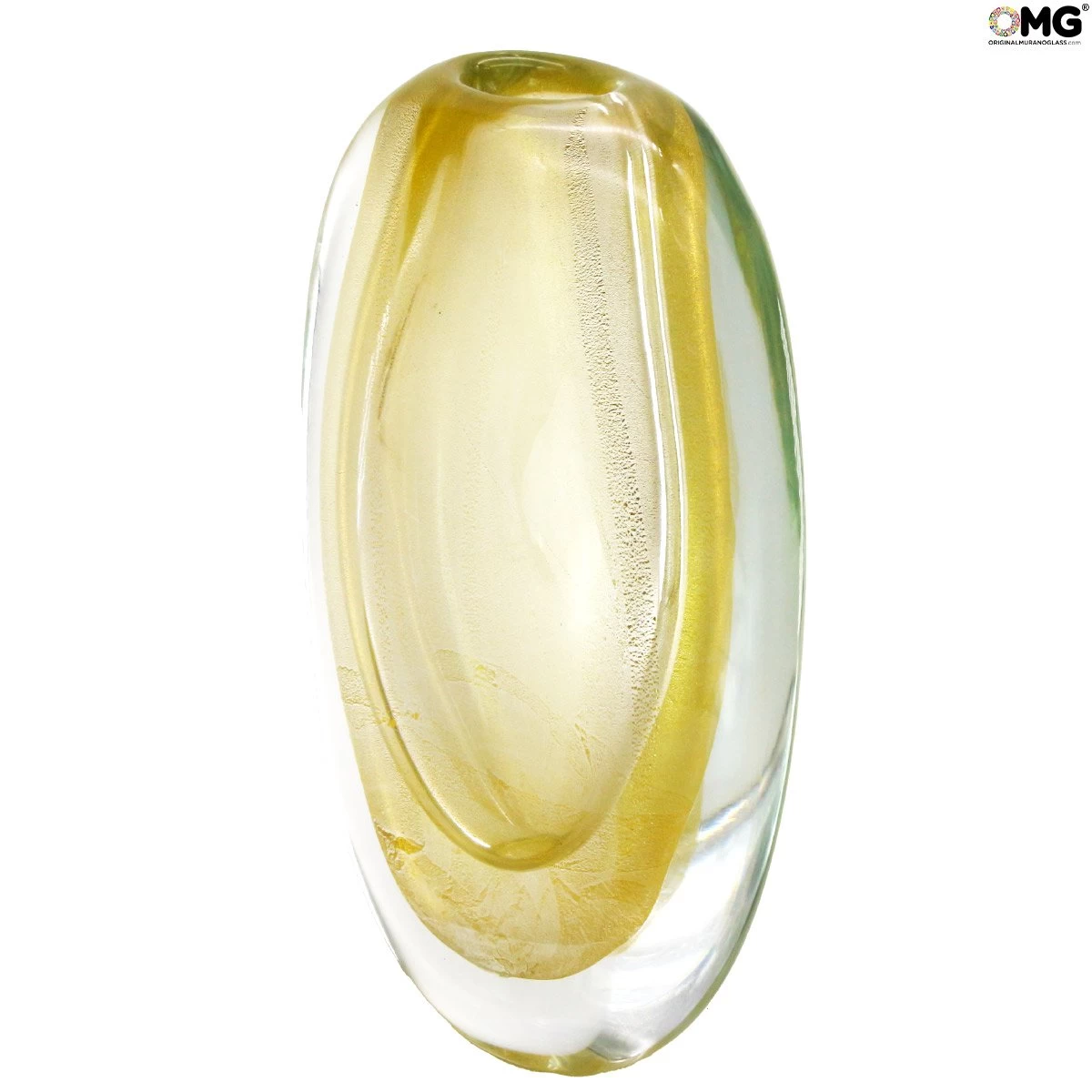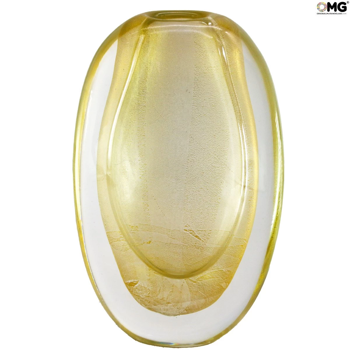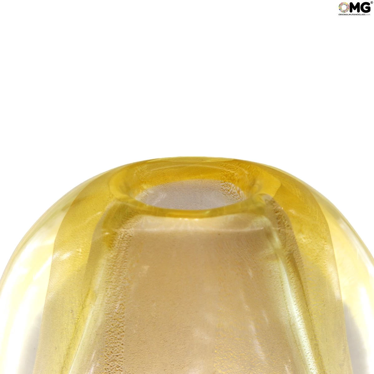 The gold leaf is the element that gives to this vase its particular aurea. A classic centerpiece becomes in this way an art object usefull for decorating an imperial table or a wood furniture. For sure gold has been ever seen as an element of richness and powerfulnes. Used together with glass it remember us today the past centuries, when the Serenissima was an imperial over the sea and the others country of Mediteranean sea. An example about how glass masters of Murano used to transform in art what they lived. A vase who doesn’t need flowers to talk about elegance and richness. Try it on a dark wood surface or over the fireplace to highlight the gold listings. Discover all the collection!