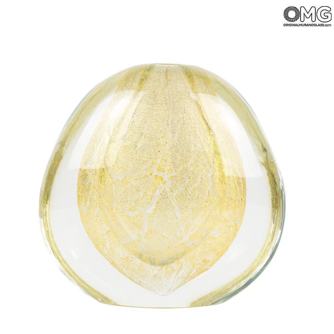 The gold leaf is the element that gives to this vase its particular aurea. A classic centerpiece becomes in this way an art object usefull for decorating an imperial table or a wood furniture. For sure gold has been ever seen as an element of richness and powerfulnes. Used together with glass it remember us today the past centuries, when the Serenissima was an imperial over the sea and the others country of Mediteranean sea. An example about how glass masters of Murano used to transform in art what they lived. A vase who doesn’t need flowers to talk about elegance and richness. Try it on a dark wood surface or over the fireplace to highlight the gold listings. Discover all the collection!