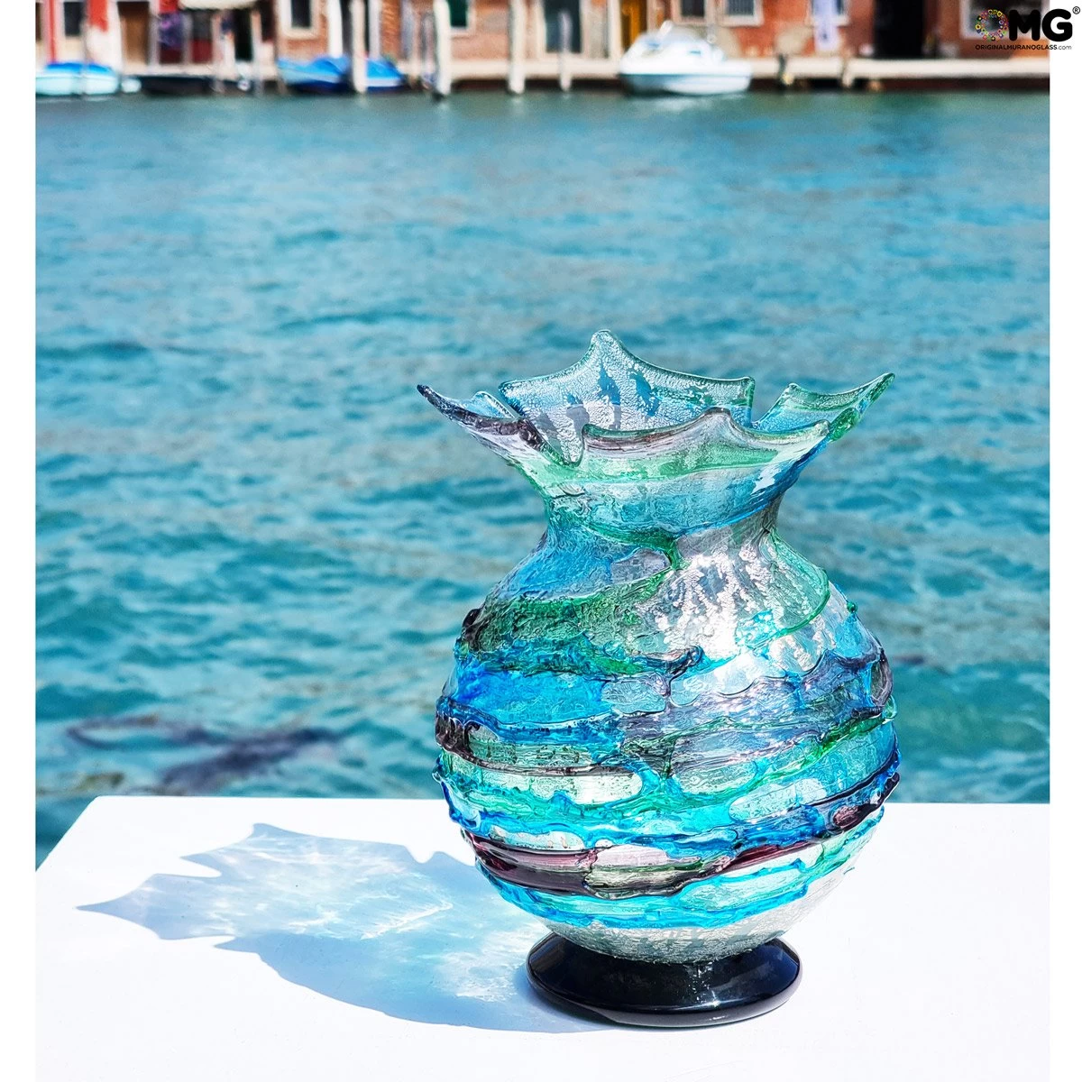 Gorgeous abstract threads of color wrap the bottom of this shimmering blue vase, bringing to life the unique vision of the artist inspired by a mix of art trends from Art Nouveau of Klimt to Abstract Expressionism of Kandinsky. Wavy, almost fluid form of the vase completes the vision and brings elegant touch of Venetian art to the design. Enjoy this beautiful vase in your home, or give it as a fine rare gift for a momentous occasion to the special people in your life. The vase is very well packaged to avoid damage . The vase is a unique piece of art made by hand, hence some variations of colors and patterns inside glass are possible and serve as additional assurance of the authenticity of this Murano Glass Venetian vase.