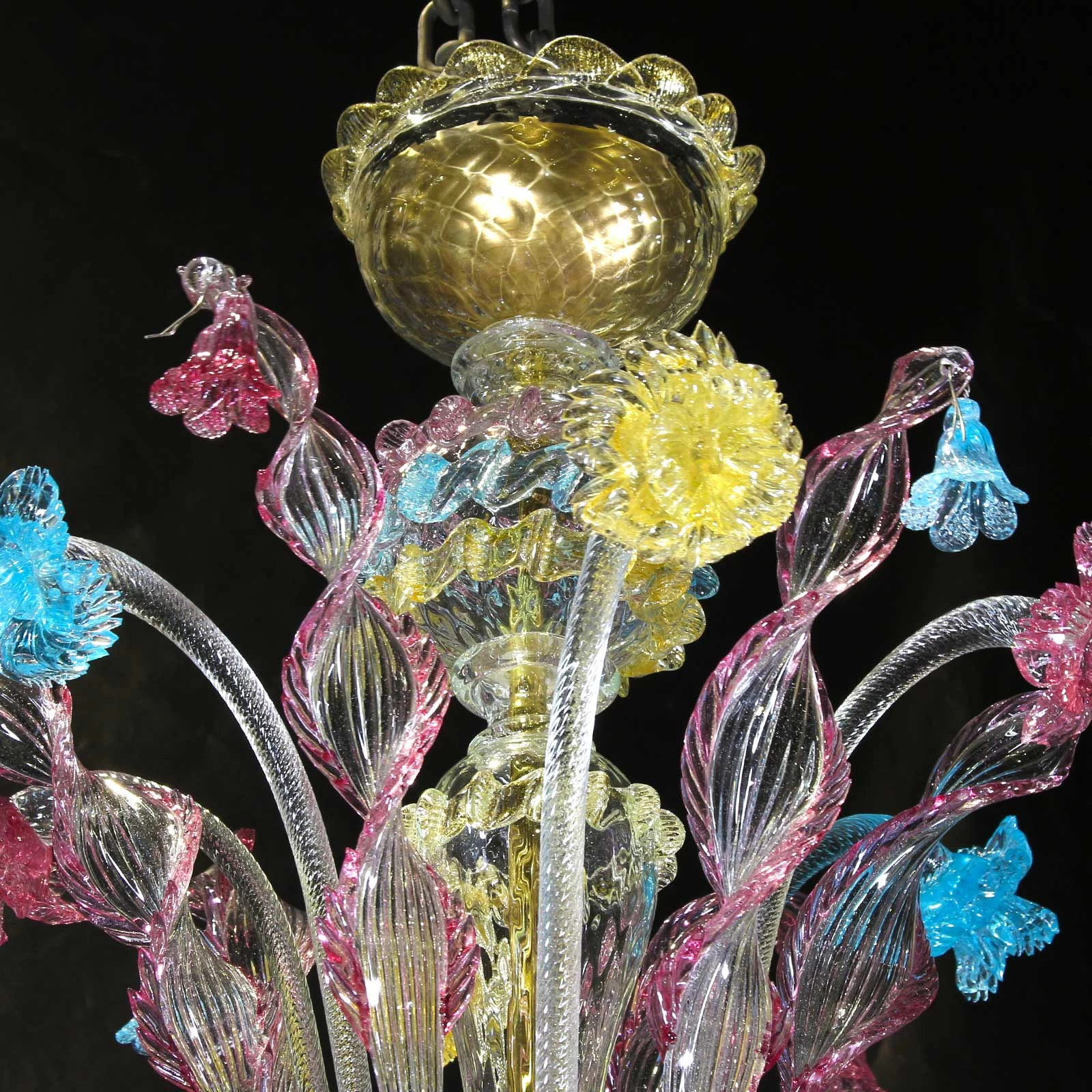 The artwork is a floral chandelier in Venetian style, this Murano chandelier enriches any interior room with elegance; Ideal for any room space, classique but also modern interior design. This venetian chandelier is an art piece itself, completely decorated and shaped by hand.