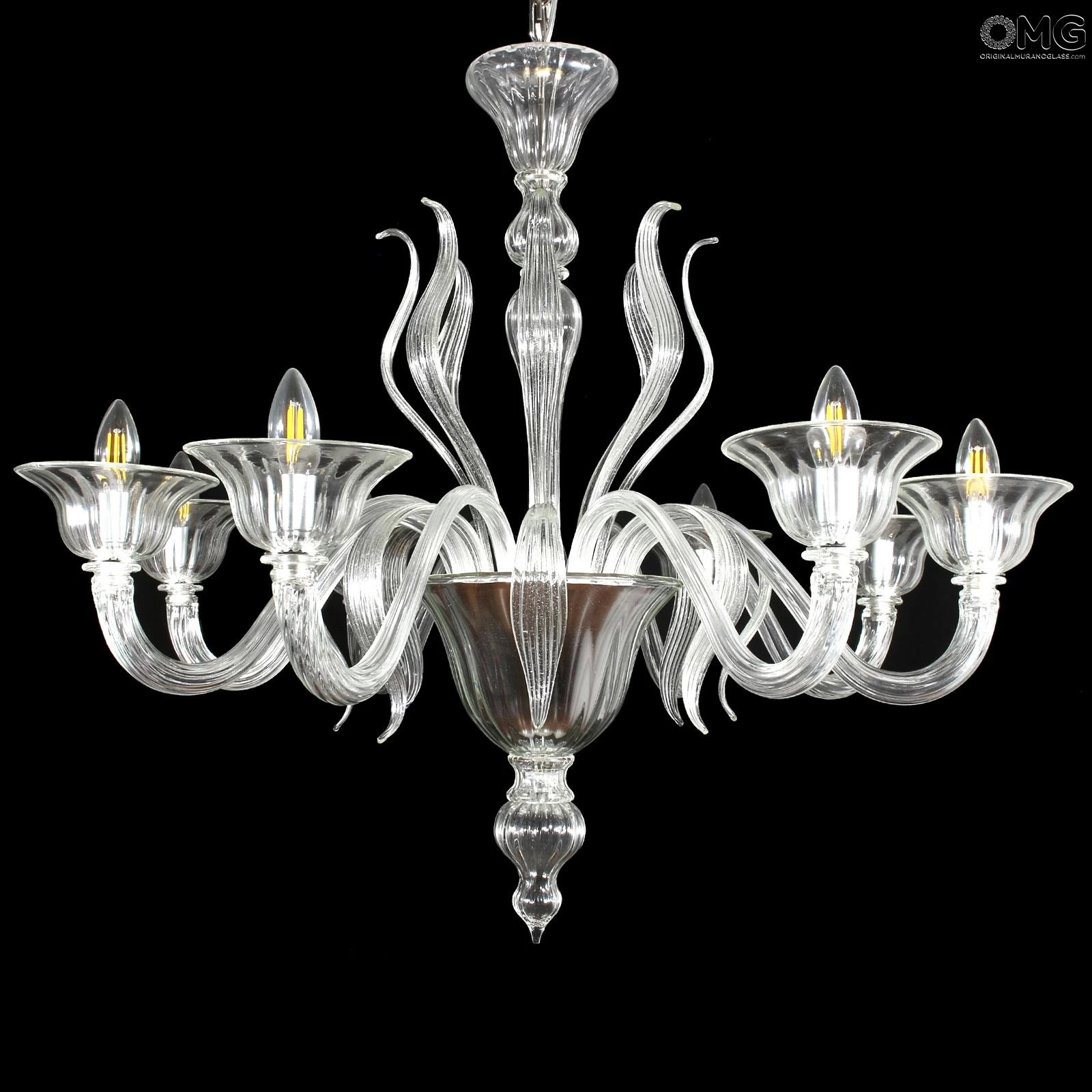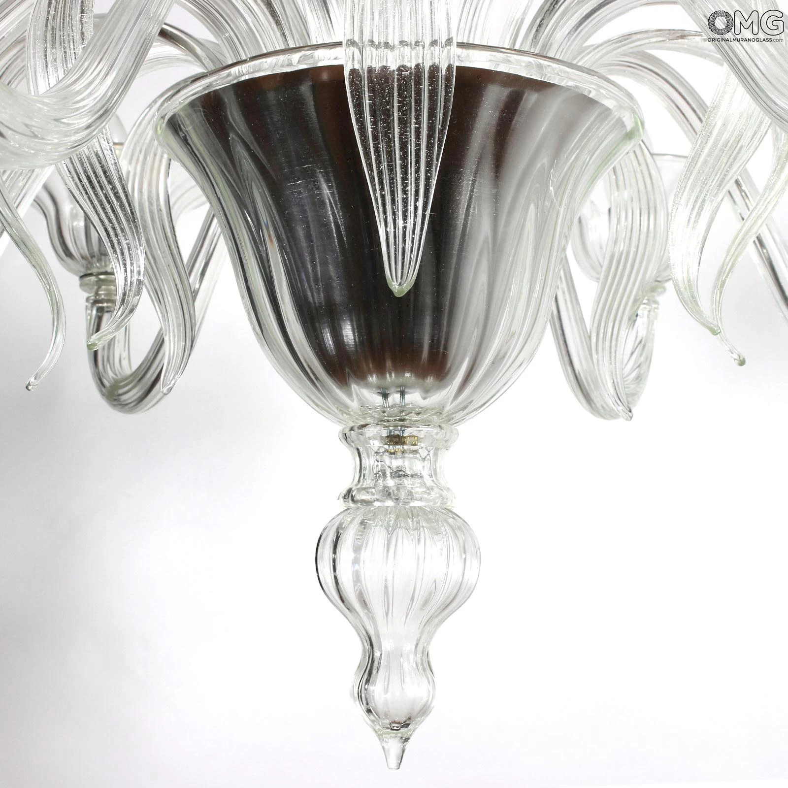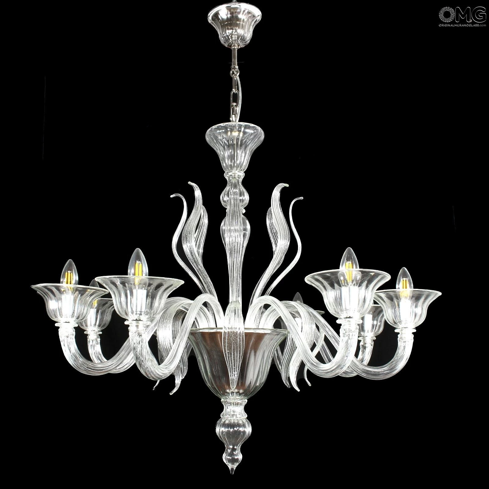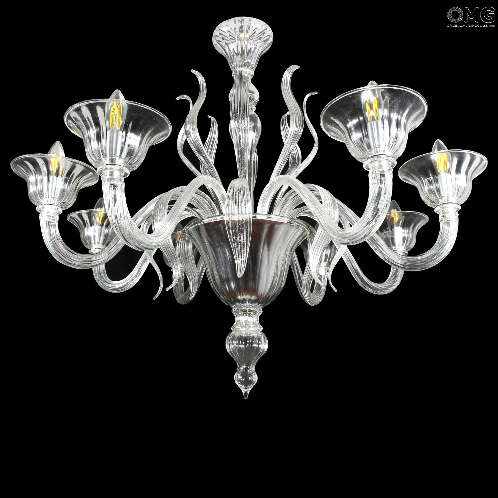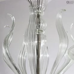 The artwork is a clear glass chandelier in Venetian style, this Murano chandelier enriches any interior room with elegance; Ideal for any room space, classique but also modern interior design. This venetian chandelier is an art piece itself, completely decorated and shaped by hand.