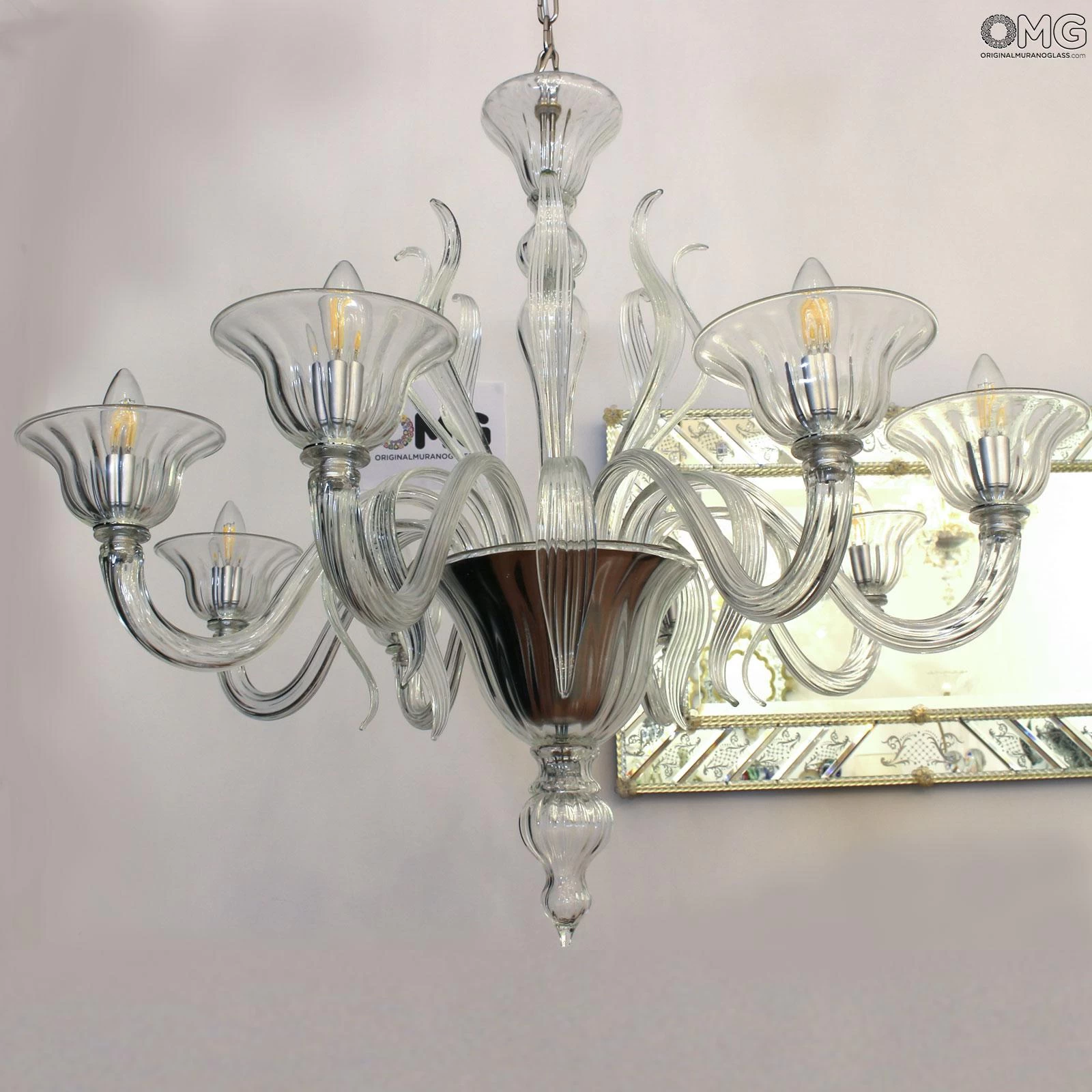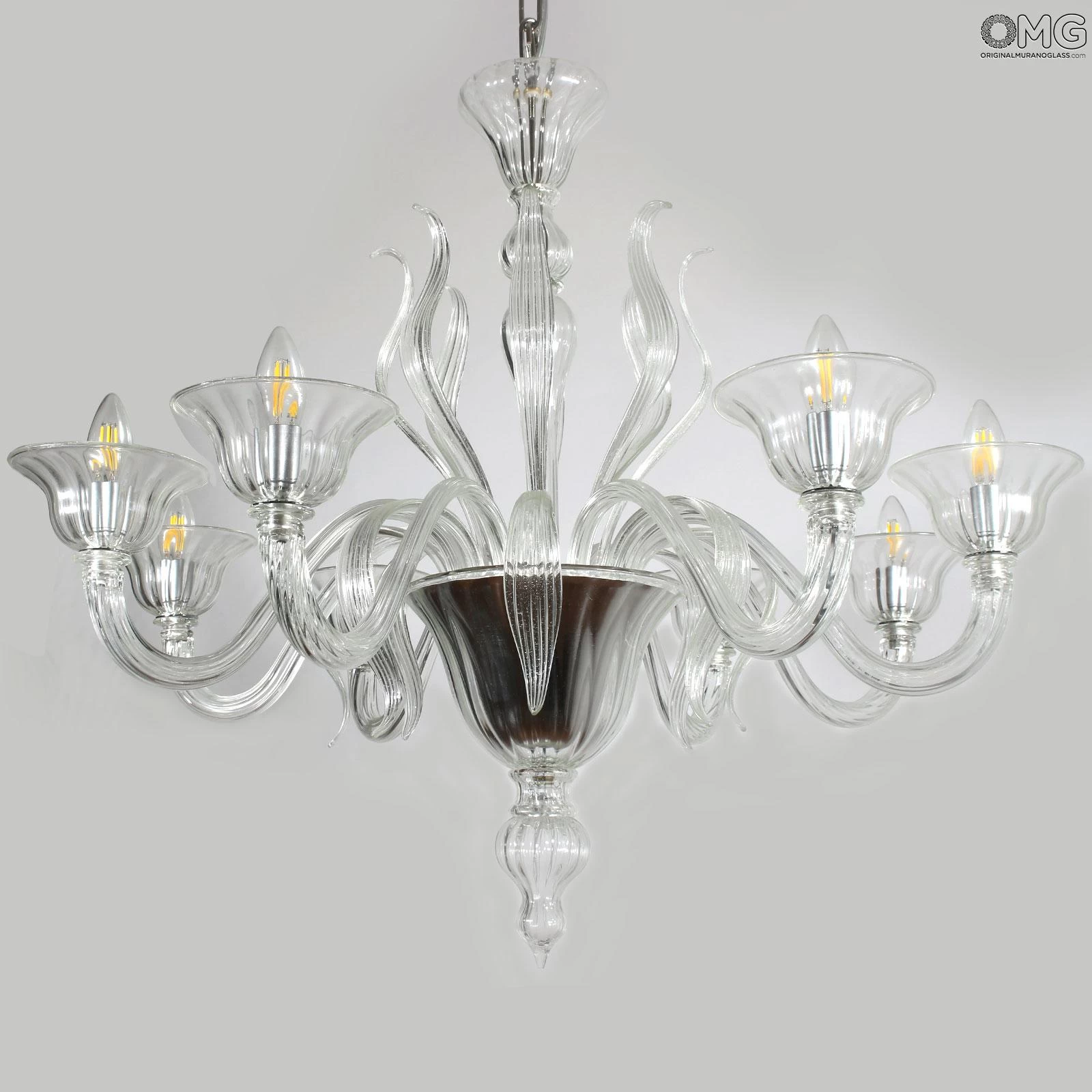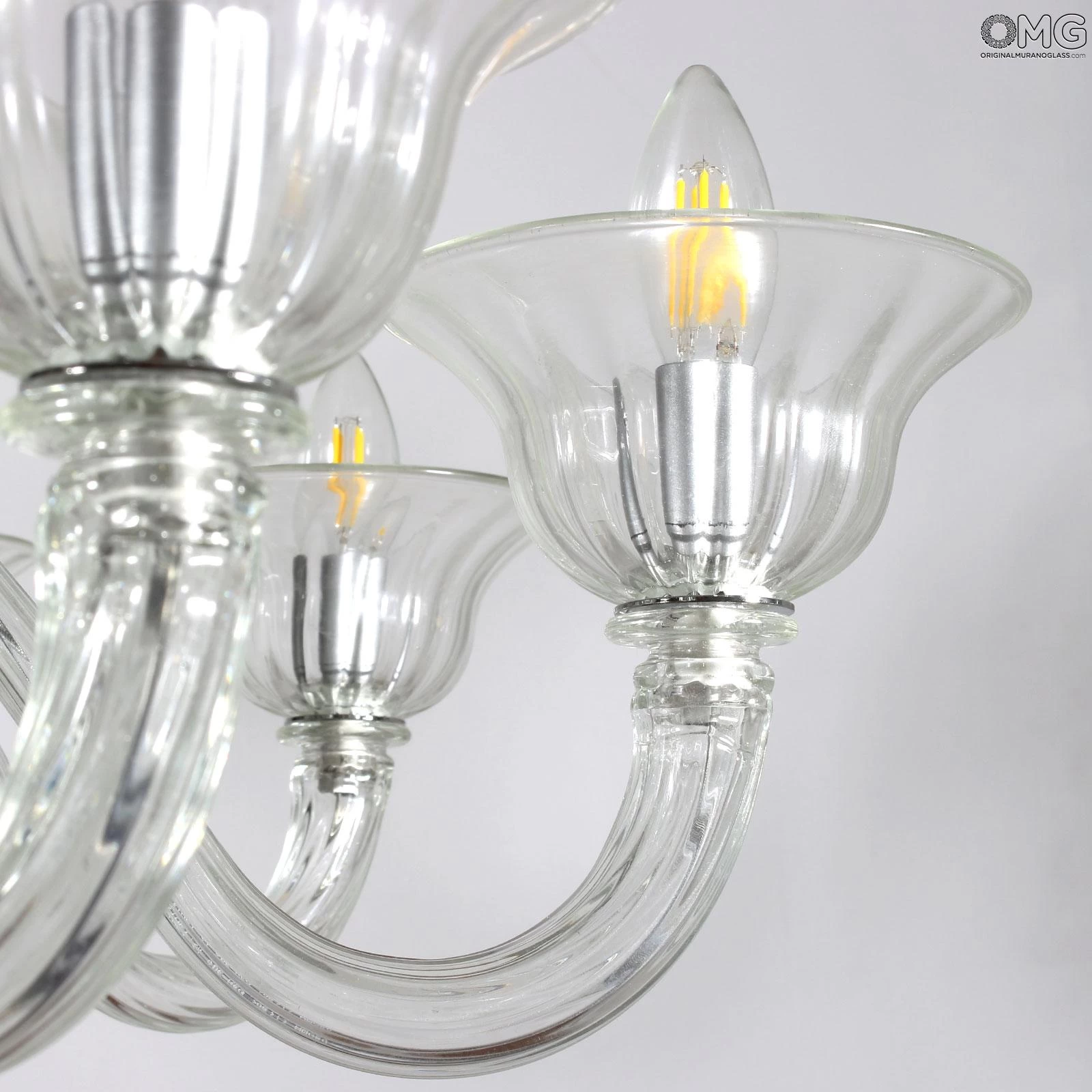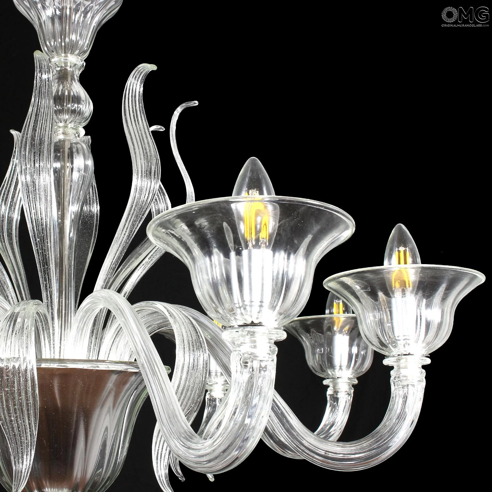The artwork is a clear glass chandelier in Venetian style, this Murano chandelier enriches any interior room with elegance; Ideal for any room space, classique but also modern interior design. This venetian chandelier is an art piece itself, completely decorated and shaped by hand.