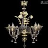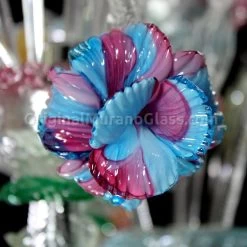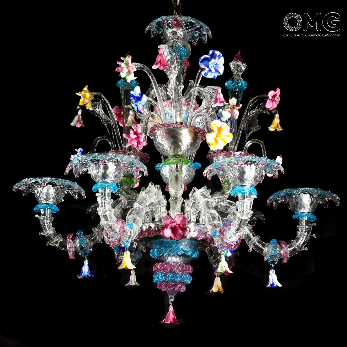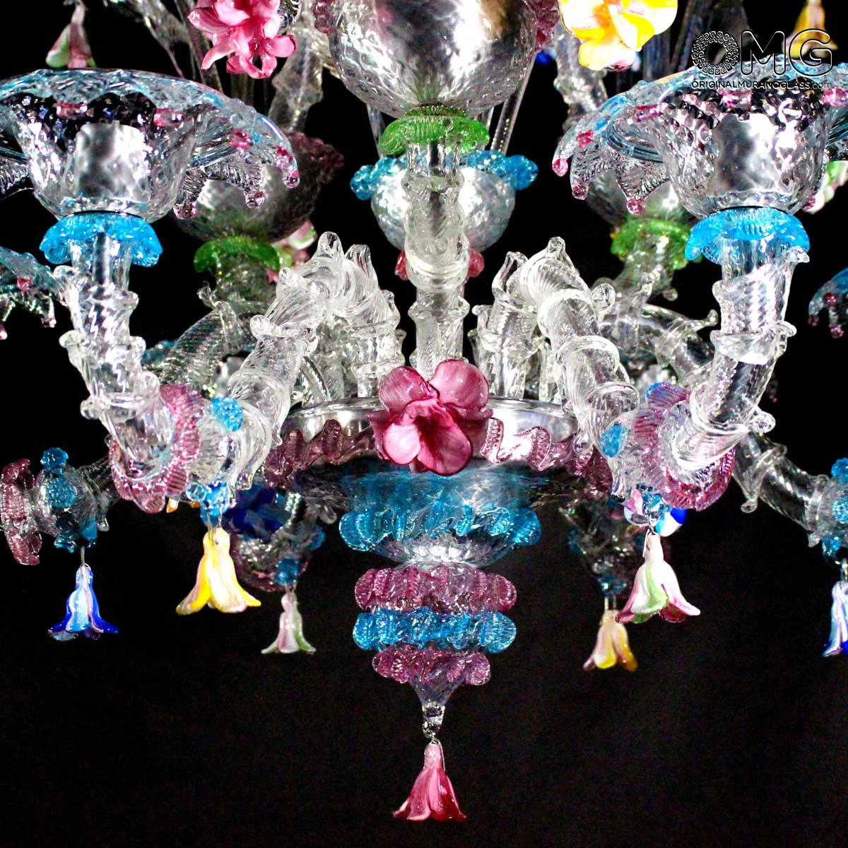 Rezzonico Venetian Chandelier in Original Murano Glass, artistic crystal with colorful details and flowers glass paste.Â