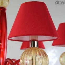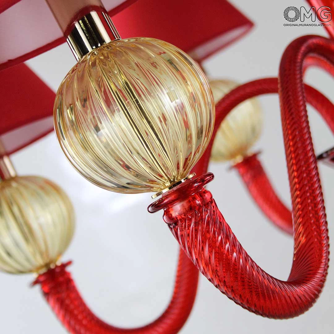 Venetian Chandelier, art glass red color with gold 24 kt balls and details. Lampshades in red organza.