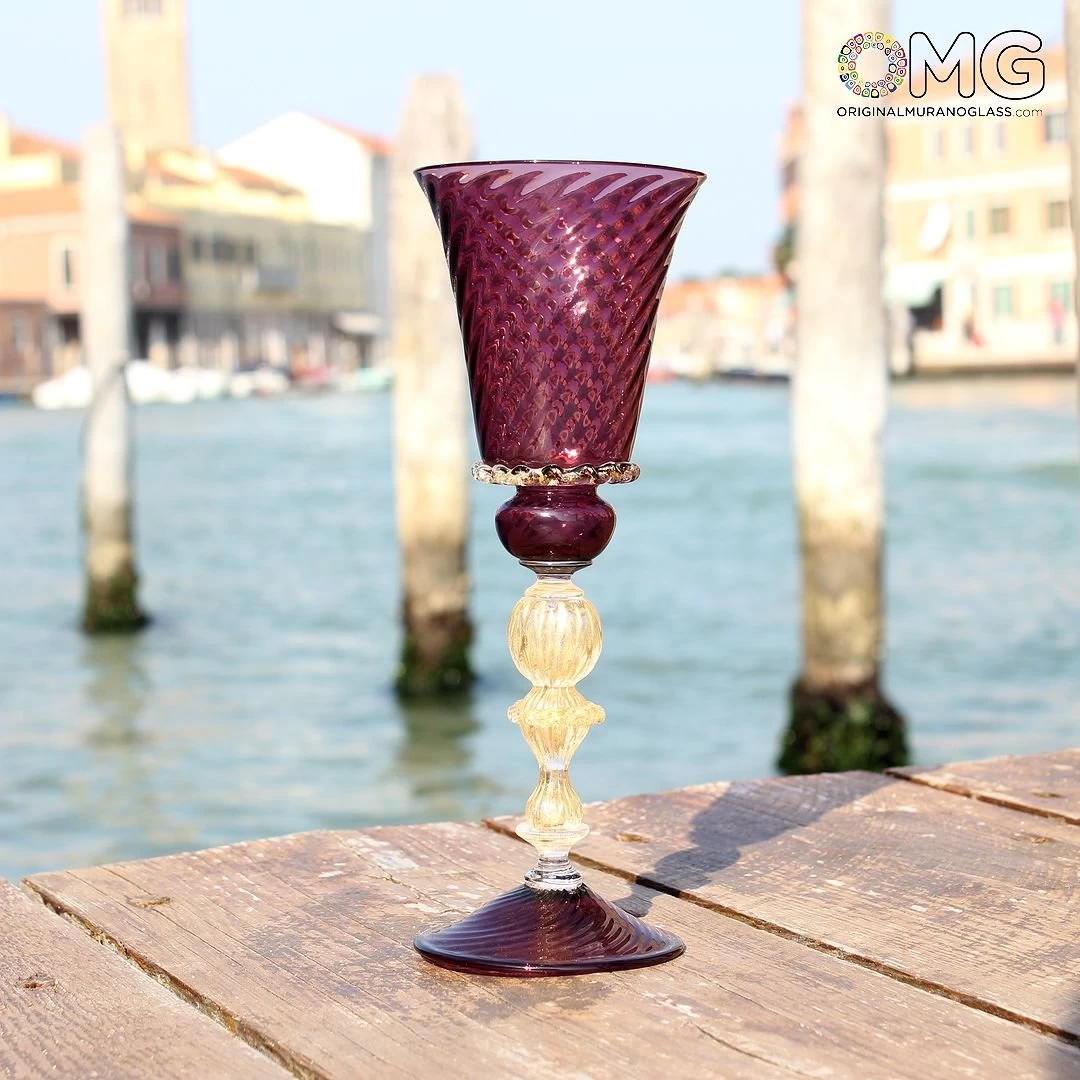 Blown glass goblet decorated with purple glass. Gold leaf decoration in the stem. Perfect details.