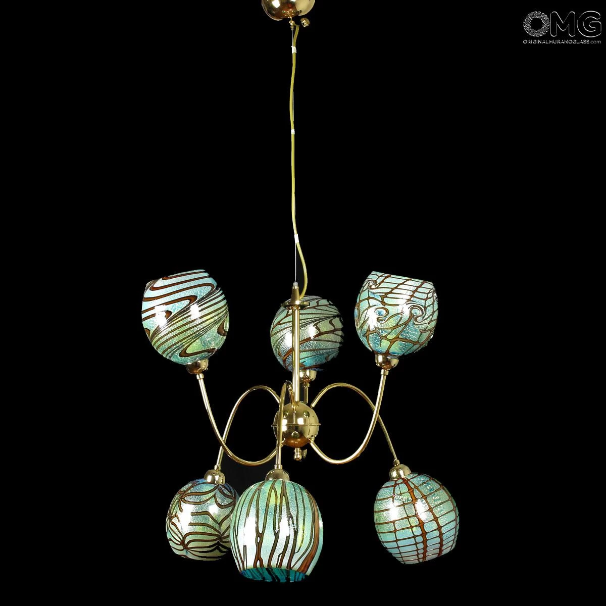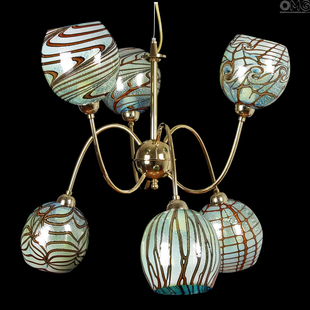 Original Murano Glass hanging lamp handmade in original venetian glass, with 6 cups holder in artistic glass. The cup is very elegant. This Murano glass light will enrich your living room bed room and any room space with unique light colors.
